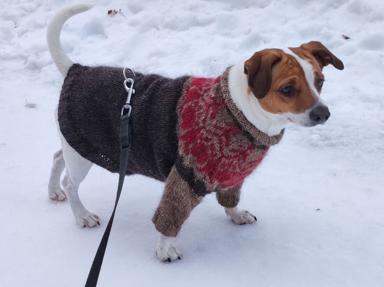 Tanskalaisruotsalainen pihakoira Lulu pukeutuu mielellään mamman tekemään islantilaisneuleeseen.