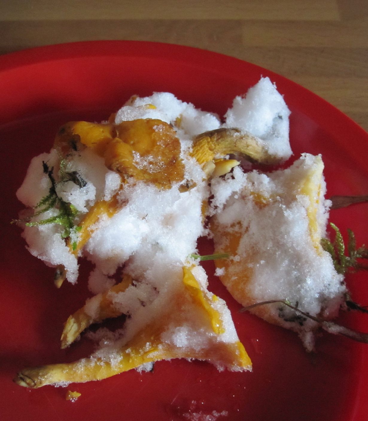 Kun pari vuotta sitten syksyllä läksimme mökiltä, kesäkeittiön nurkalle rantaan jäi kasvamaan pieniä kanttarellin alkuja. Kun tulimme seuraavan kerran lokakuun lopulla, alkoi matkalla sataa lunta ja yhtäkkiä olikin ihan talvi. Kun tiesin, missä kohtaa sienet kasvoivat, kävin kaivamassa ne lumen alta. Olivat kasvaneet ja hyviltä maistuivat.
