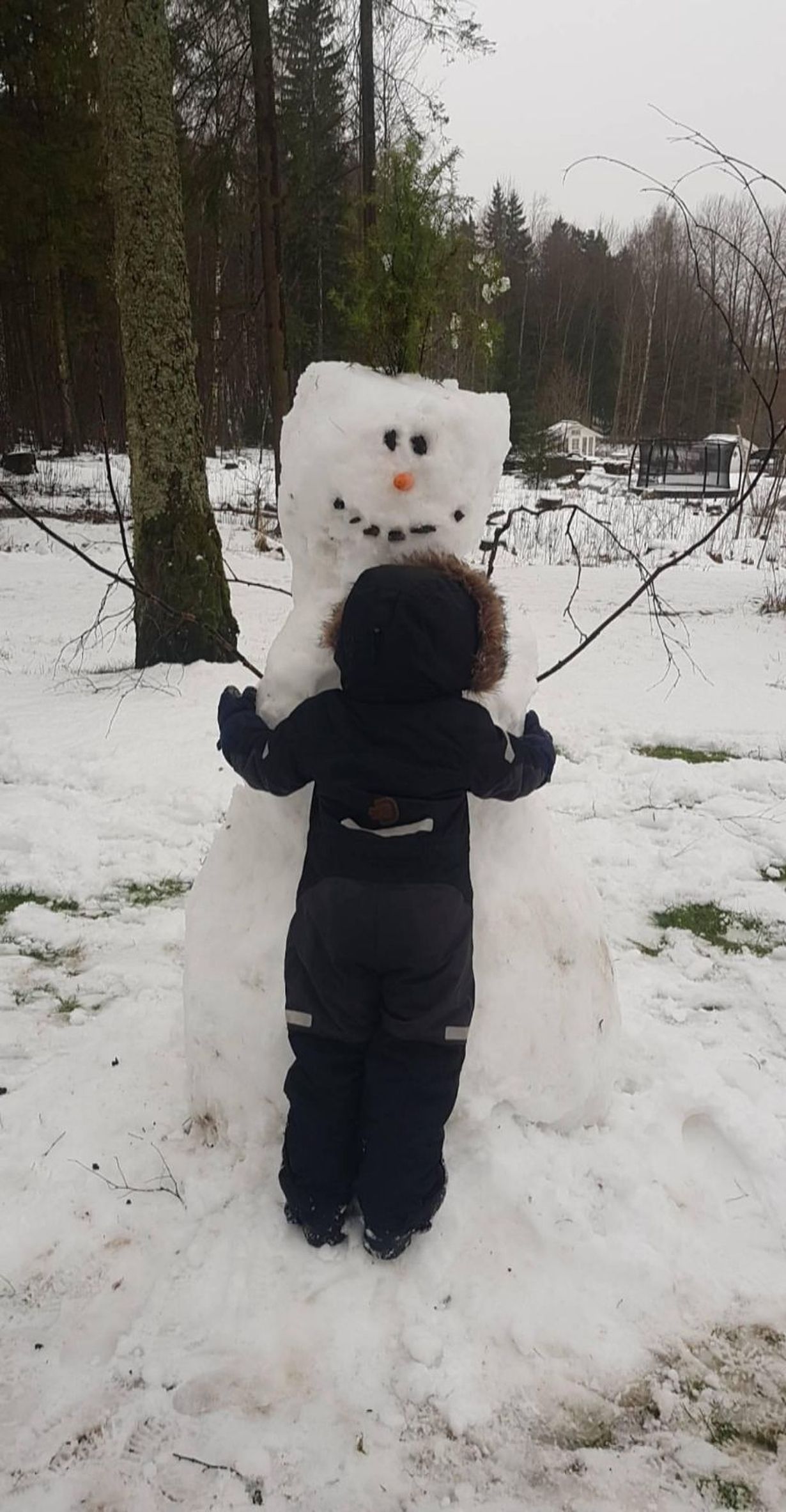 Kun vihdoin satoi lunta paikkakunnallemmekin päätimme yhdessä tehdä lumiukon. Poikamme halusi, että lämpimistä haleista tykkäävä lumiukkomme saisi myös siivet joilla lentää korkealla taivaalla, pilvien korkeudella niinkuin hänen pikkusiskonsakin, se oli tärkeää. Nyt kun lumiukostamme on jäljellä enään vain tyhjä paikka, poikamma sanoi, että nyt lumiukkomme liitelee iloisesti taivaalla.