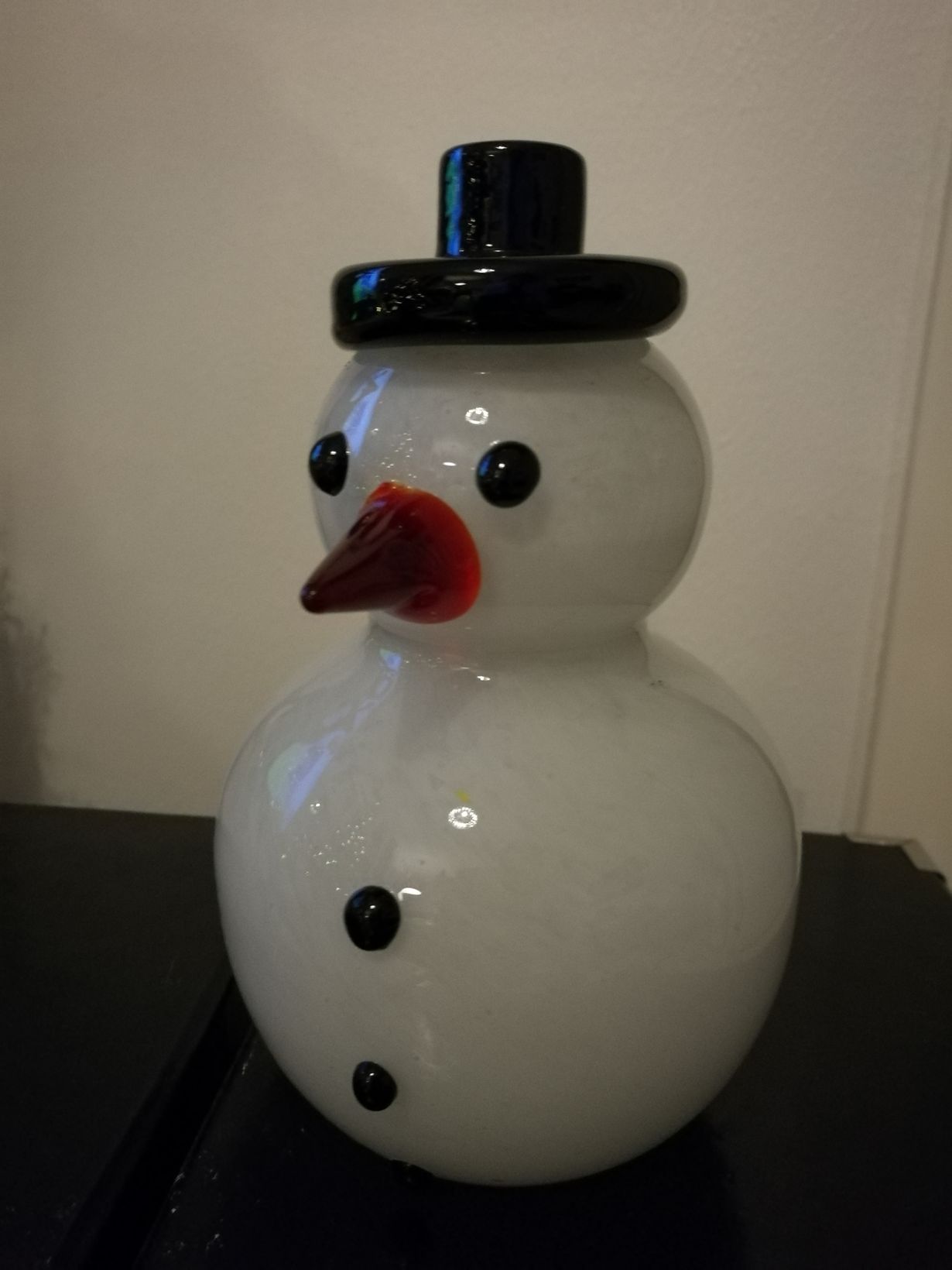 Lumiukko 'etelän tapaan'. Espoossa ei oikein ole ollut lunta, joten jouduin ostamaan lumiukon. Hyvä puoli on se että tätä lumiukkoa voi pitää myös sisällä.