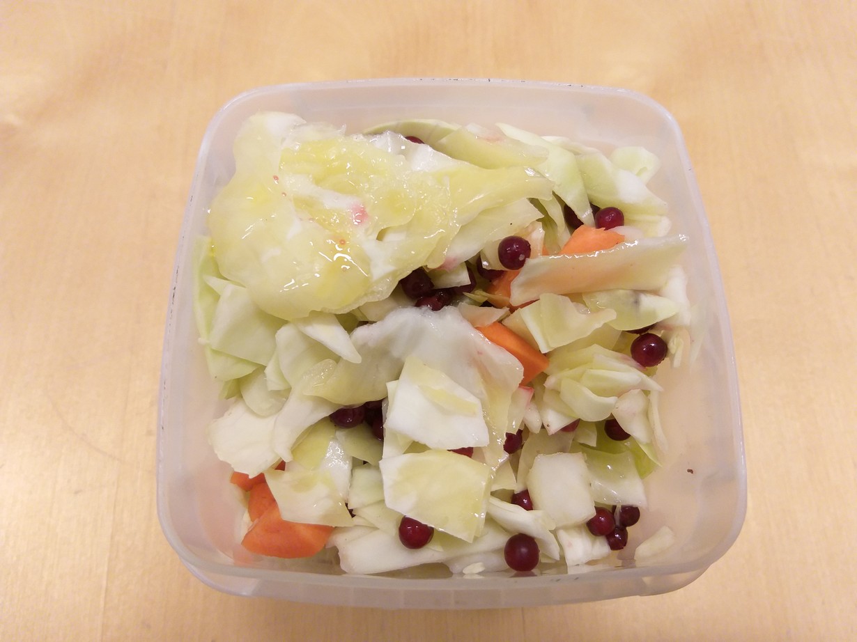 Kaalia, porkkanaa, varsiselleriä, puolukkaa ja oliiviöljyä. Kaikki luomua ja kotimaista paitsi oliiviöljy. Tätä tekee sangollisen muutamassa minuutissa.