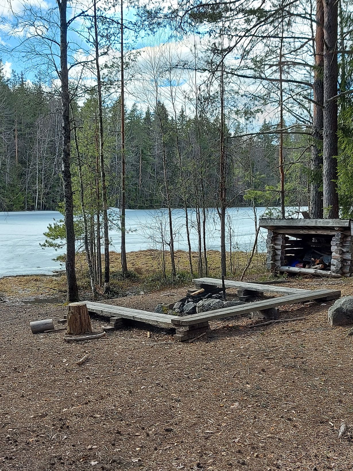 Rohkeina lähdimme uuden paikkakuntamme kuntopolulle. Ikuisuudelta tuntuvan tarpomisen jälkeen, lenkkareilla lumessa, mudassa ja vedessä, eteemme avautui hiljainen paratiisi. Laavu joka oli aivan kuiva, vielä jäässä olevan lammen rannalla. Tänne tulemme piknikille kesällä.