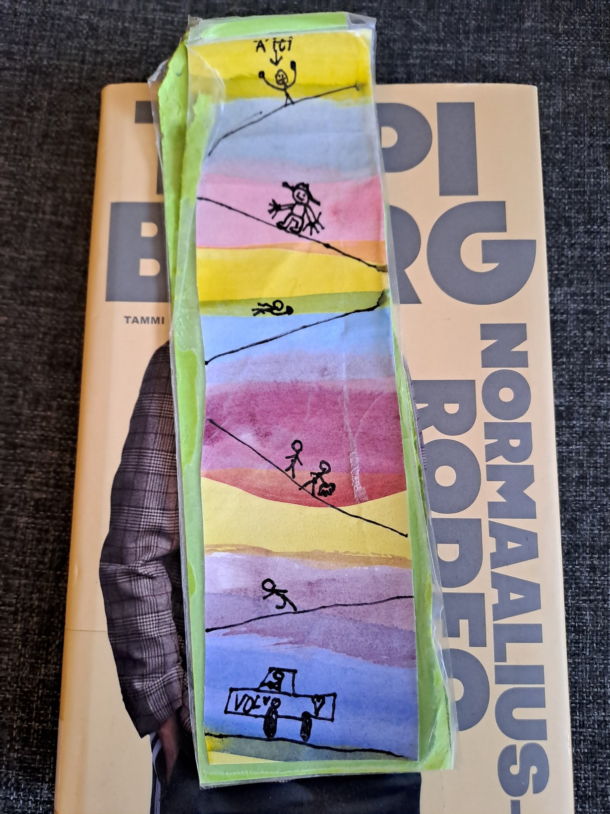 Nyt jo aikuinen poikani on ekaluokalla askarrellut tämän äitienpäivälahjaksi. Laminointi vähän repsottaa, mutta ei vaikuta rakkaan kirjanmerkin toimivuuteen. Ja äiti on edelleenkin Volvo-naisia, kuten vuonna 2012 kun tämän ihanan värikkään lahjan sain!