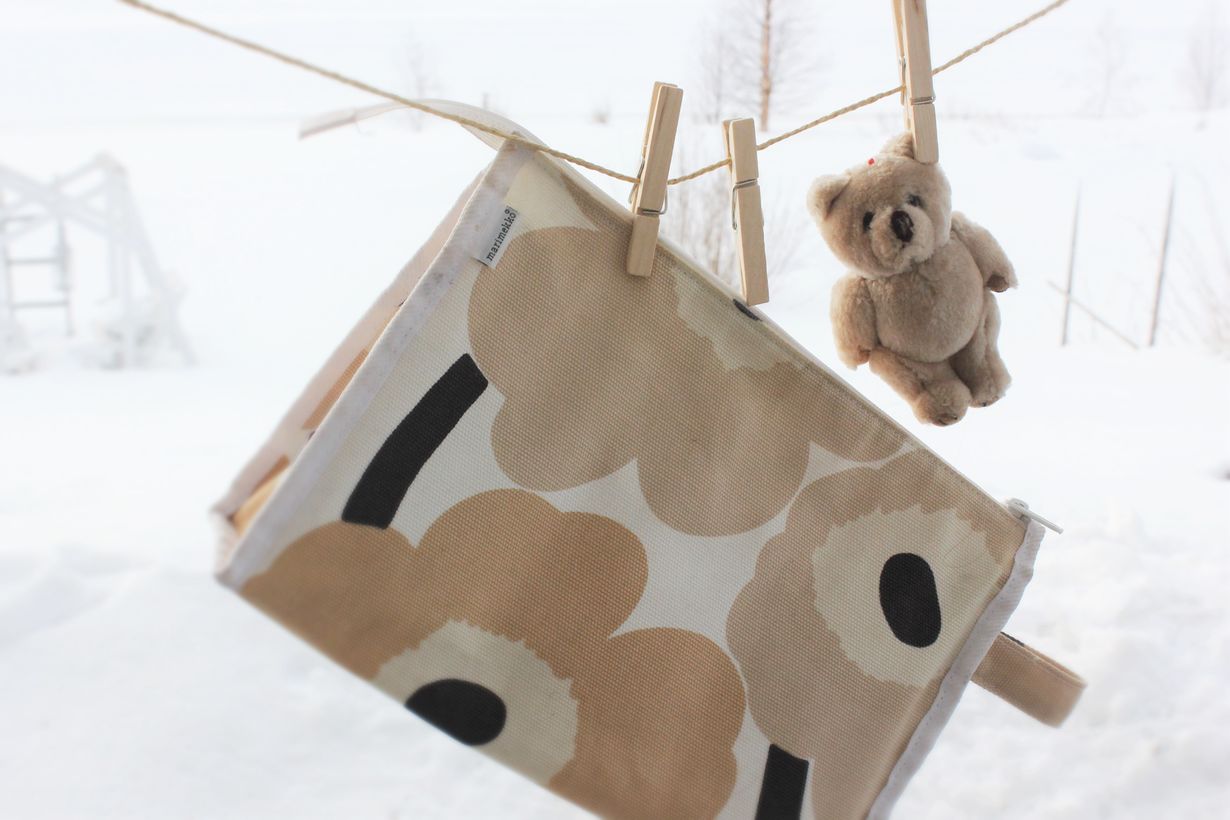 Marimekon ajaton pussukka on kulkenut mukana monet reissut ja pikku nallemaskotti on kuulunut pakettiin alusta asti.