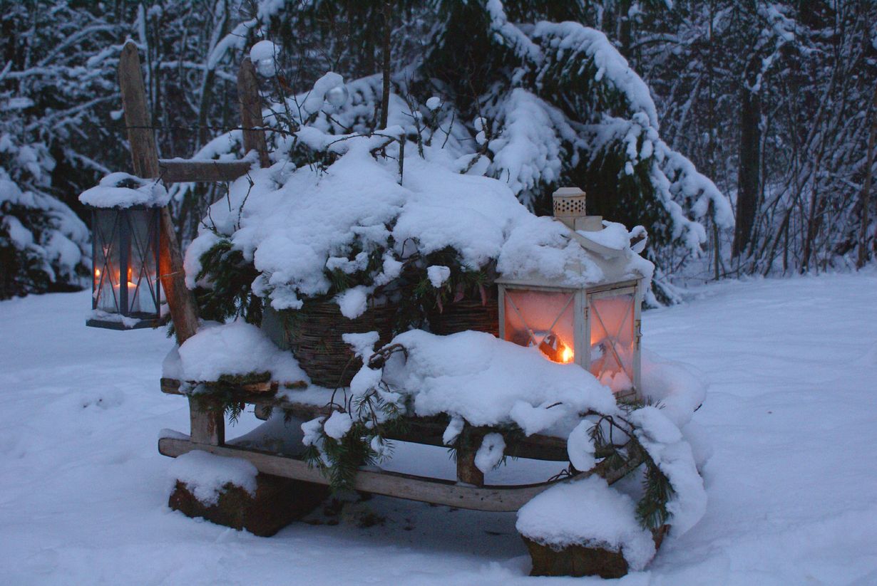 Koristelimme lasten kanssa kelkan hyvissä ajoin ennen lumentuloa havuilla, oksilla, muutamalla hopeisella joulukuusen pallolla sekä tietysti lyhdyillä. Lumen tultua asetelma oli täydellinen.