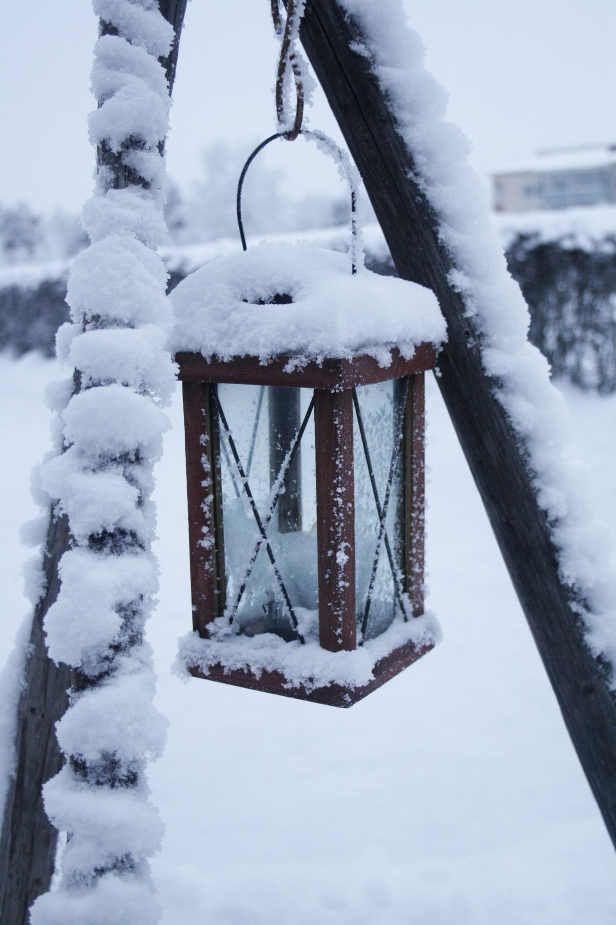 Muisto lapsuudestani; heinäseipäät, jotka ''telineenä'' lyhdylleni. Kynttilän tuike lyhdyssä tekee arjesta juhlavan kauniin ja luonto tuo oman säväyksensä lumihunnullaan tähän kokonaisuuteen.