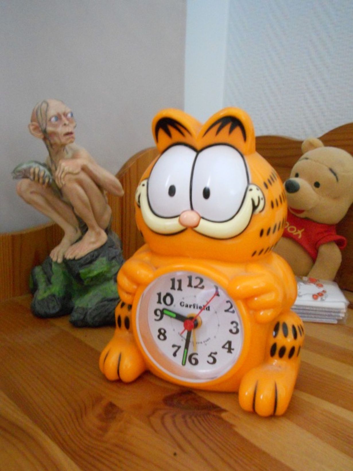 Kyseessä on siis Karvinen herätyskello, joka on ostettu Aikakullasta vuonna kivi ja kanto ja on siitä lähtien palvellut mukisematta herätyshommissa. kello herättää aamulla kauniilla soitolla ja se sammutetaan painamalla karvista nenästä:D kello on erikoisen näköinen ja siksi hyvin rakas esine.