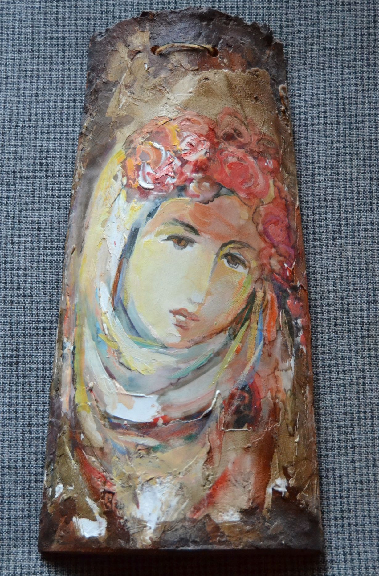 Vanhaan kattotiileen maalattu nainen. Näin maalauksen Bulgariassa pienen myyntikojun takahuoneen seinällä. Kojun pitäjän tytär oli kuvan maalannut ja oli iki onnellinen kun halusin sen ostaa.