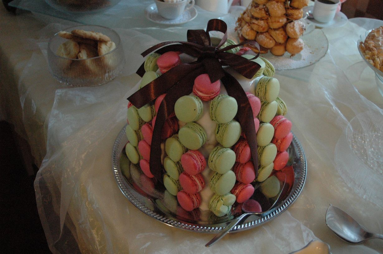 Lahjapaketin muotoon - ainakin yritetty väsätä - tämä macaronleivoksilla vuorattu kakku.