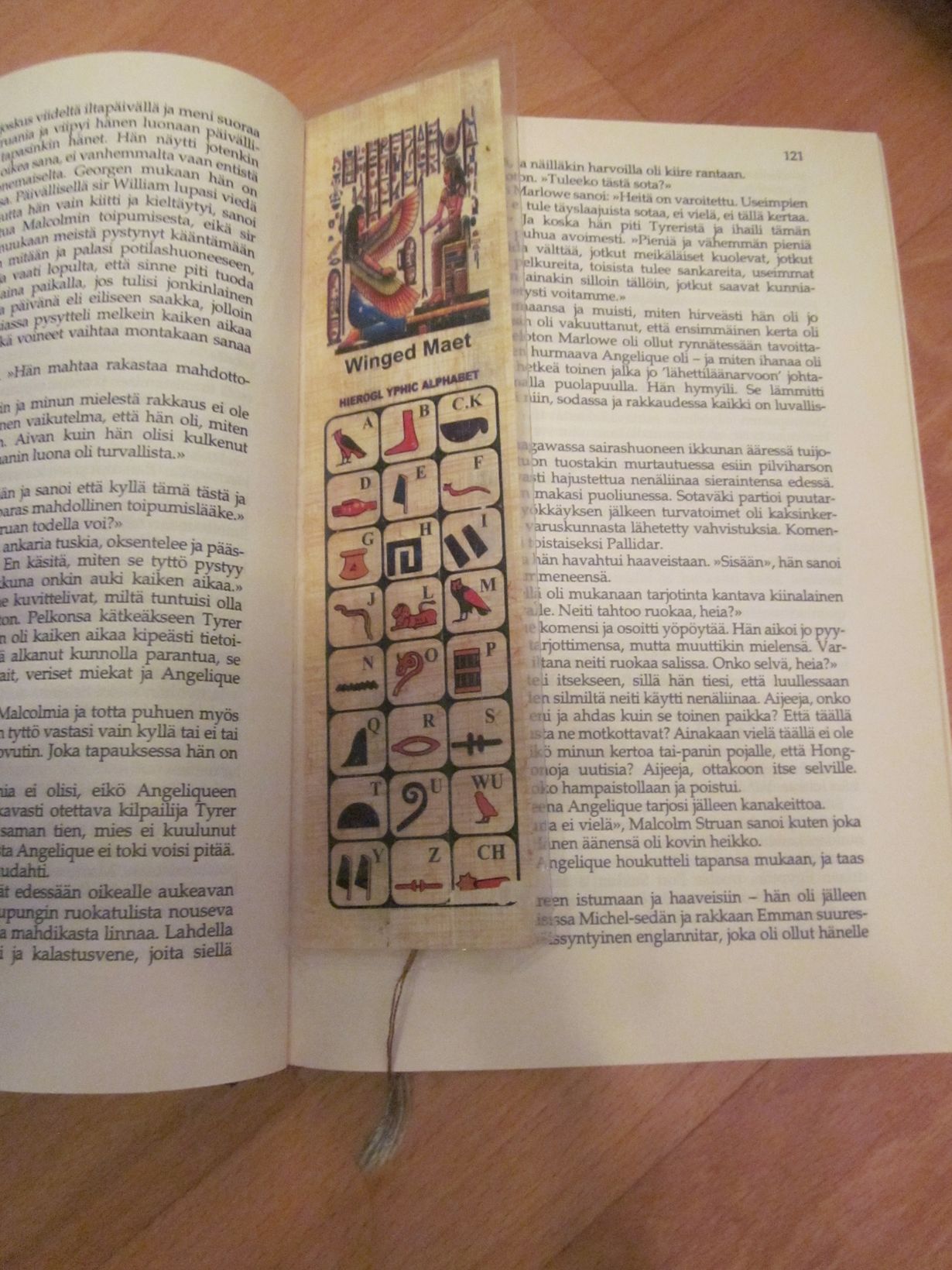 Ostin tuliaisia Egyptissä ja myyjä halusi antaa minulle muiston. Hän kirjoitti nimeni kirjanmerkin taakse egyptiksi. Kirjanmerkki on papyrys paperista tehty.