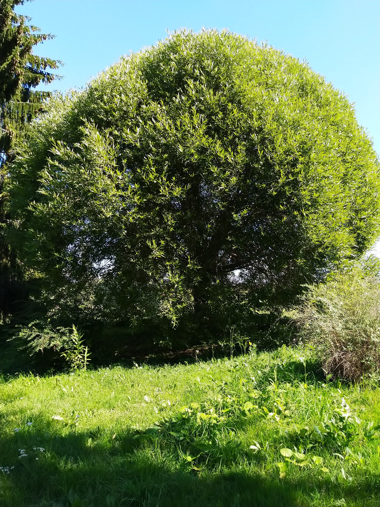 Kahden metrin korkuisena siirretty pihaamme, koska naapuri luuli istuttaneensa sen omalle pihalleen. Olikin todellisuudessa meidän maalla. Vuosien varrella se on antanut oksan monen linnun pesälle.