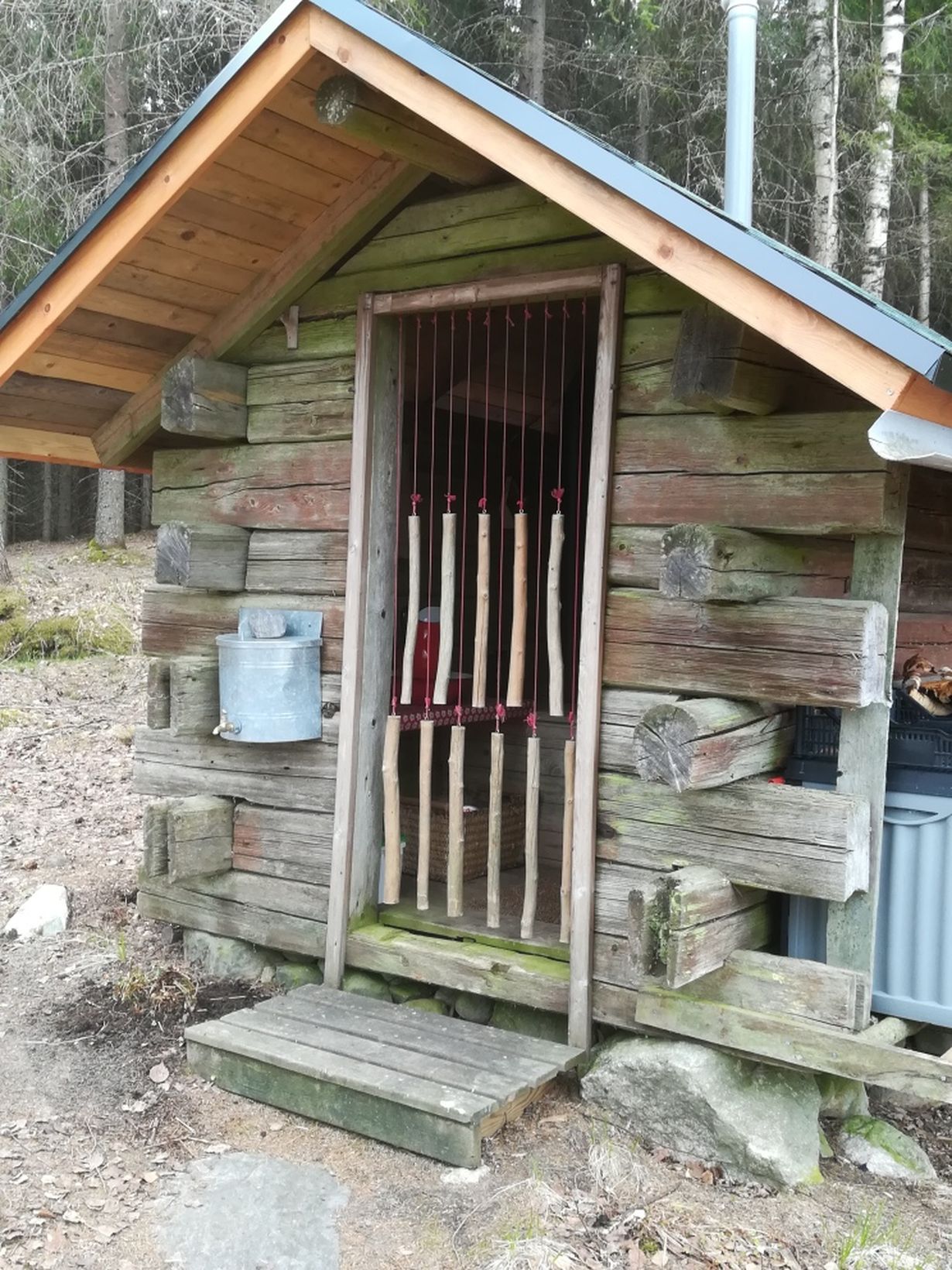Näkymä järvelle, hyvä tuuletus, ovena naruissa roikkuvat leppäkapulat. Ovi on mukaeltu poroaidan portti. Hirret vanhoja ylijäämähirsiä mökin rakennuksesta.