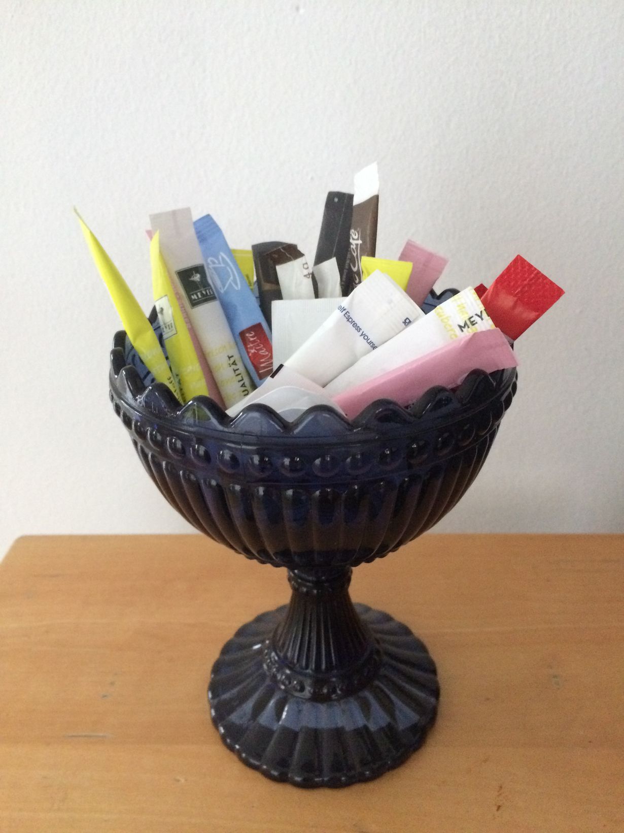 Tämä on meidän terassi-sokeriastia. Kuppi on tuttu ja turvallinen, mutta täynnä makeaa maailmalta. En haali matkamuistoja, mutta kahvilasta lähtee mukaan sokeripussukka. Ystävien ja perheen kanssa kahvitellessa voi muistella matkoja tai vaikka vertailla sokeripussukoita.