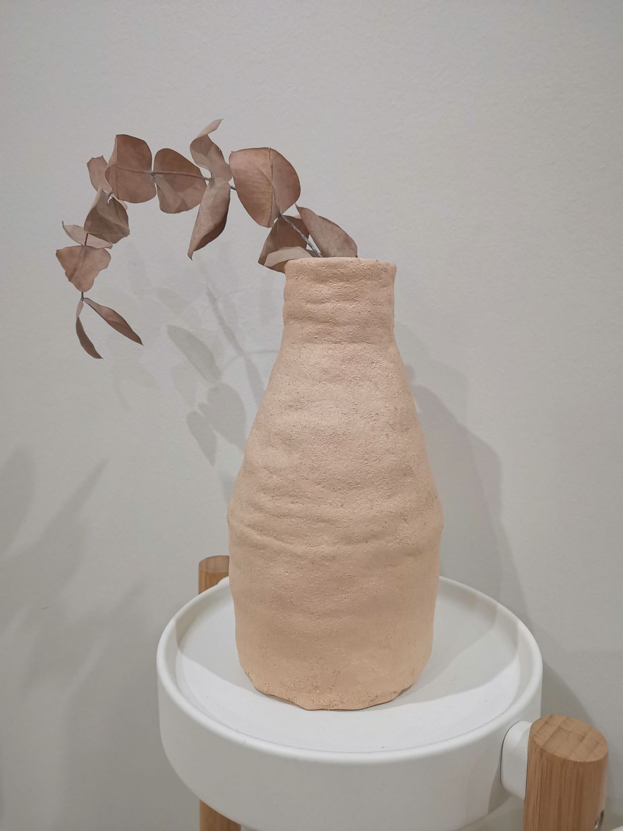 Olen tehnyt tämän itse luokanopettajaopintojeni kuvataiteen kurssilla. Tämä on tehty makkaratekniikalla, enkä halunnut sitä täysin piilottaa, vaan jätin sitä hieman näkyviin pinnoitteen alta. Osin tämänkin myötä olen ihastunut ylipäänsä erilaisiin maljakoihin ja kiinnitän niissä muotoiluun huomiota.