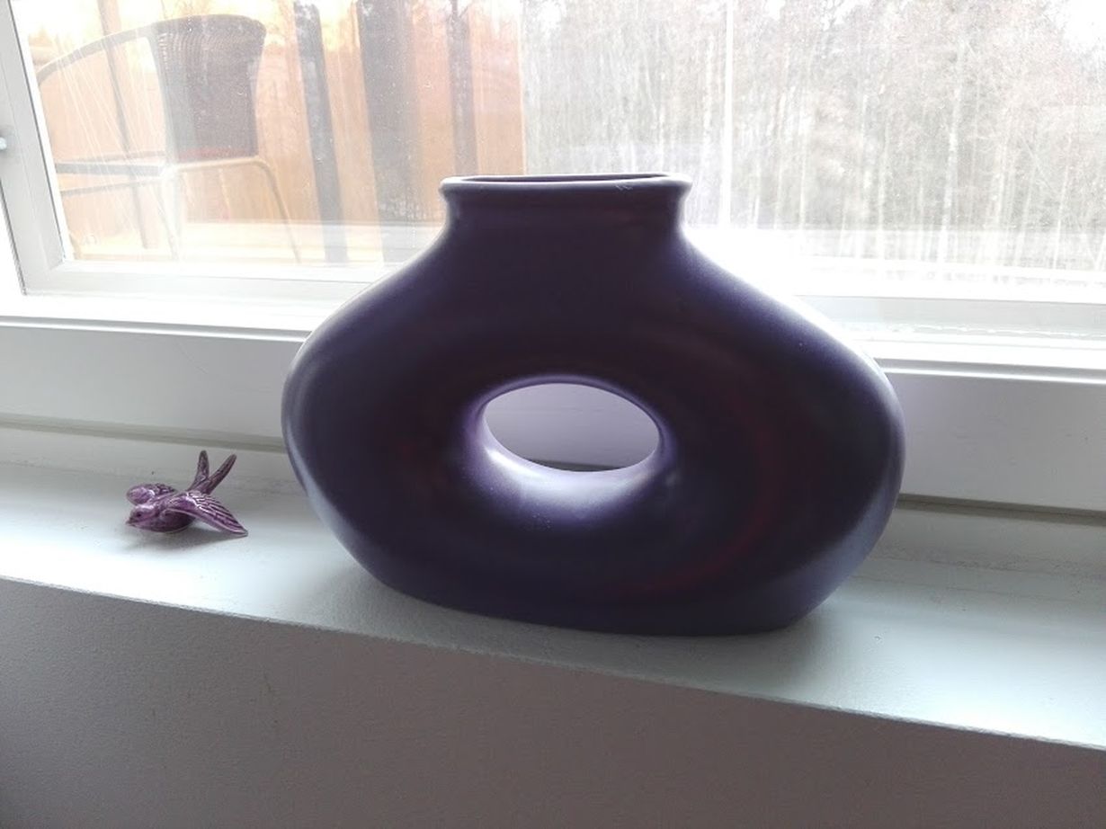 Hauska (joskin epäkäytännöllinen) vaasi tuli lahjaksi, kun vanhempani piipahtivat mökkipaikkakuntansa kirpputorilla. Muotokieli on kaunis ja ilman kukkiakin, sopii väritykseltään sisustukseeni.