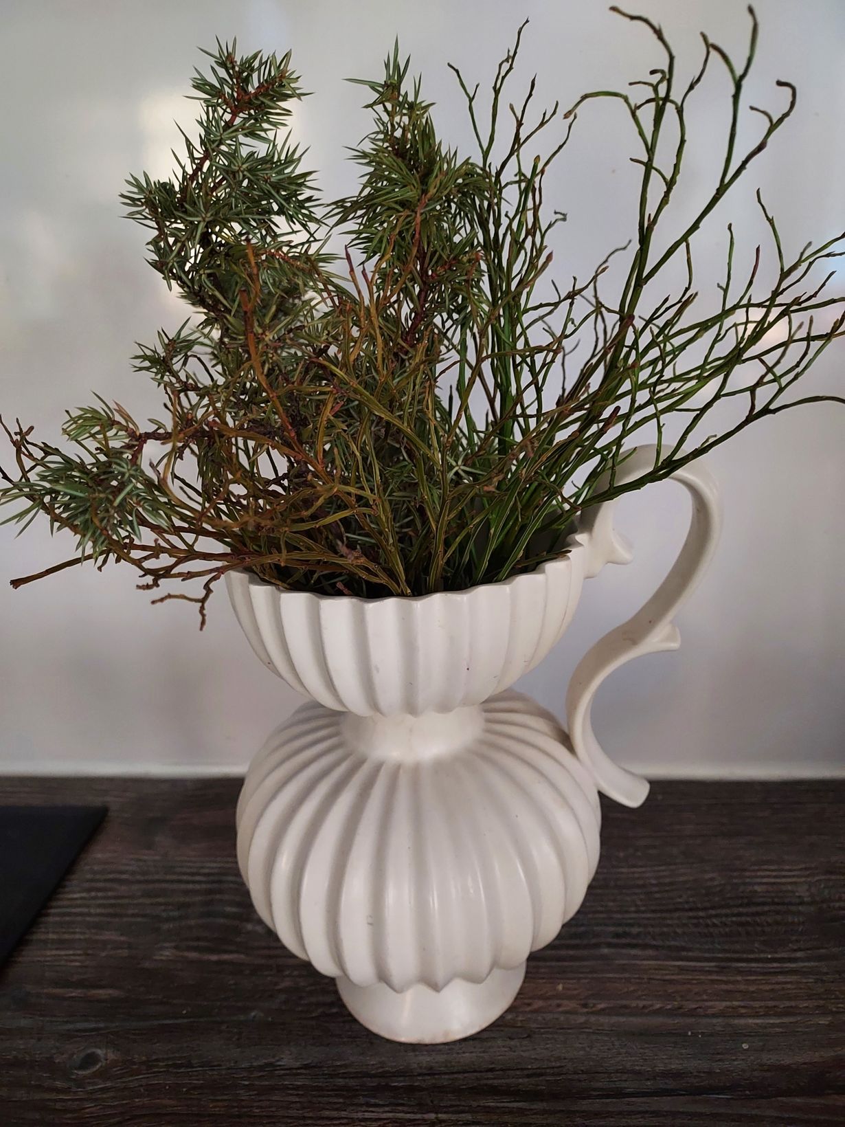 Kaikista maljakoistani eniten tykkään tästä parikymmentä vuotta sitten kirpparilta ostamastani. Tähän sopivat monenlaiset kukka-asetelmat tai vaikka varvut ja havut näin talvella.
