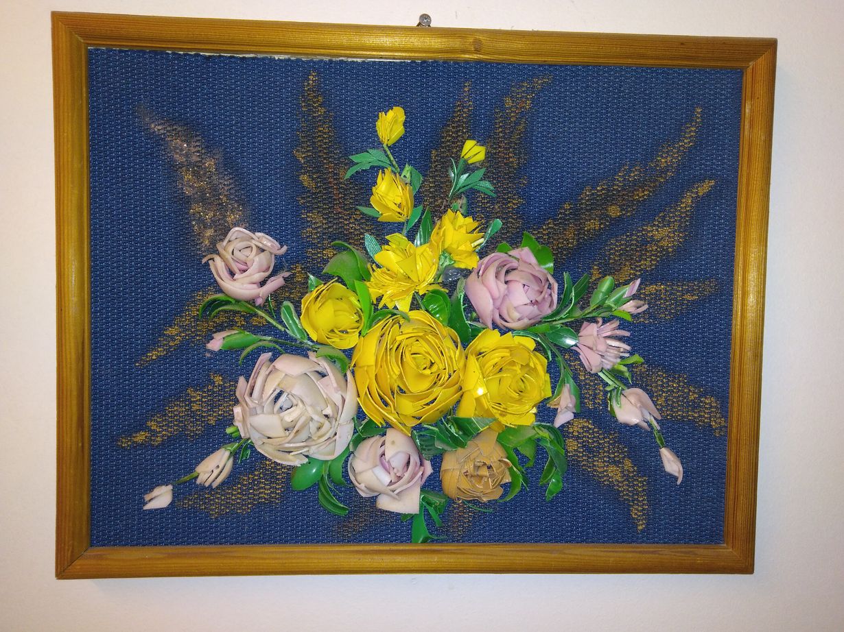 Äitini äitii oli aikaansa edellä tuunauksessa ja kierrätyksessä.Hän pilkkoi muoviset shampoopullot ja pikkupurkit peltisaksilla paloiksi ja sommitteli niistä 3D tauluja,ennen kuin koko käsitettä oli olemassa. Mamma ei tehnyt pyynnöstä tauluja, mutta minulle hän lupasi tehdä taulun kun sitä niin kovin nuorena naisena toivoin.Mamma jatkaa taiteen tekoa pilvien toisella puolen ja kulkee elämässäni päivittäin mukana,kun ohikulkiessa ihailen tätä taulua.
