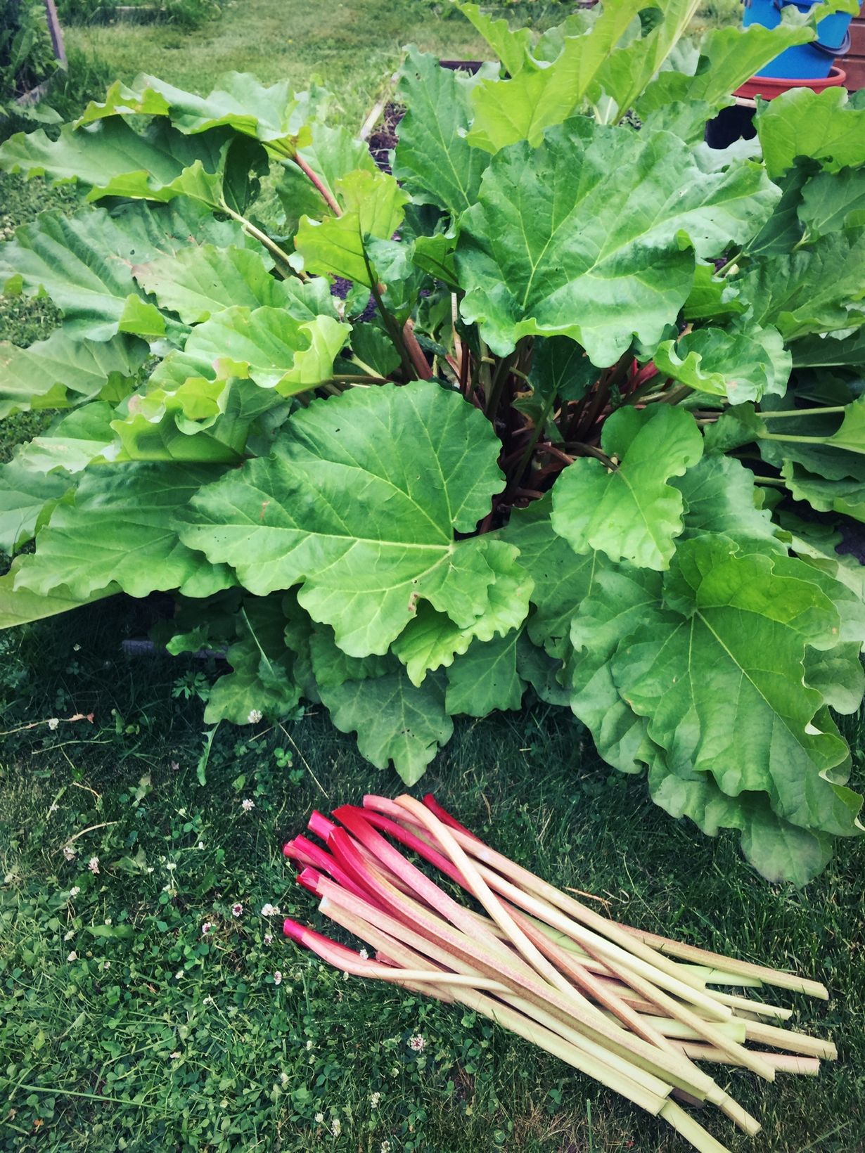 Raparperinvarsien noutaminen kasvimaalta ja jalostuminen mehuksi ja piirakaksi.