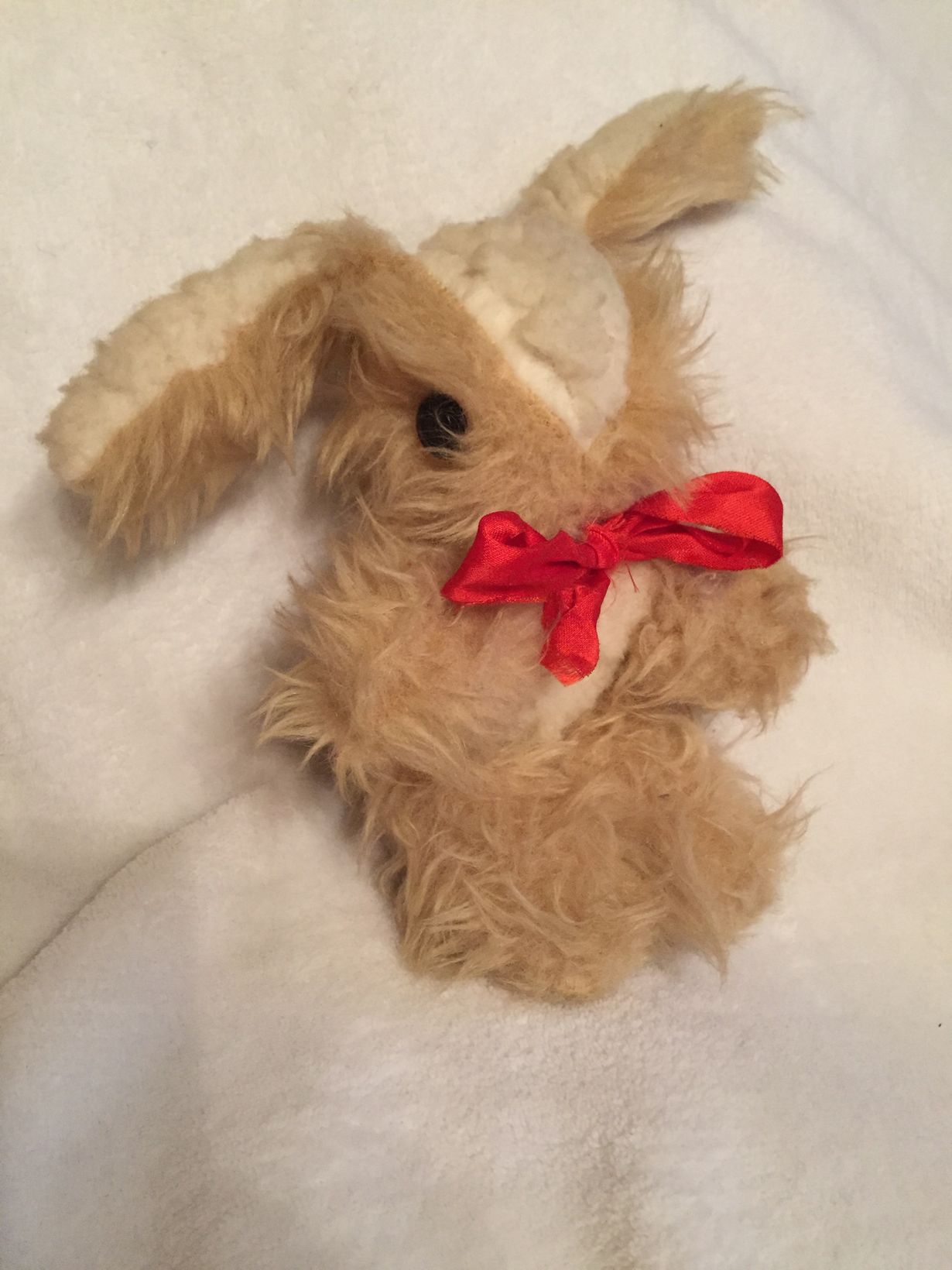 Mammani on kuollut 22vuotta sitten. Kun olin pieni, pidin hänen pehmopupustaan kovasti. Leikin aina sen kanssa. Se oli minusta äärettömän söpö ja kaunis. Olen ollut varmaan jotain kahdentoista, kun sain pupun mammaltani omaksi. Se on säilynyt tarkassa tallessa siitä asti, vaikka melkein kaikki muut lapsuudenajan tavara&lelut on jätetty naapureille muuttojen yhteydessä. Pupulla on ikää noin 40vuotta.
