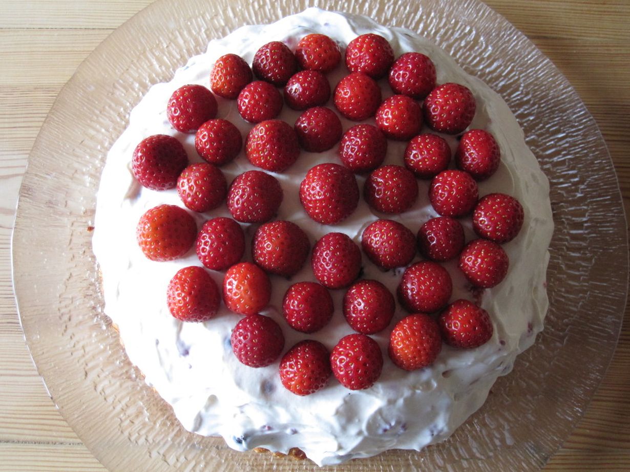 Tämä ihana arki: kakku Mansikka-aikaan 12.4.2012 klo 20:13 Kakussa on juuri omalta maalta haettuja mansikoita sekä päällä että sisällä. Kuorrutus ja sisällä kerros on rahkavaniljakastikehyydykettä.