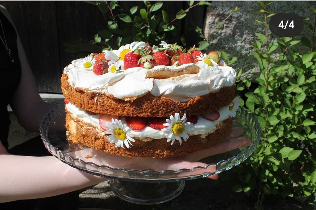 Mansikoilla ja kermavaahdolla täytetty brita-kakku.