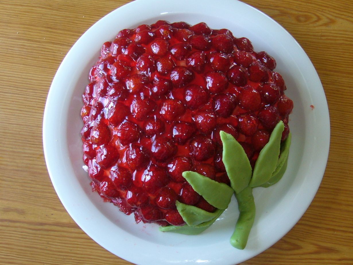 Mansikanmuotoinen mansikkakakku mansikkatäytteellä.