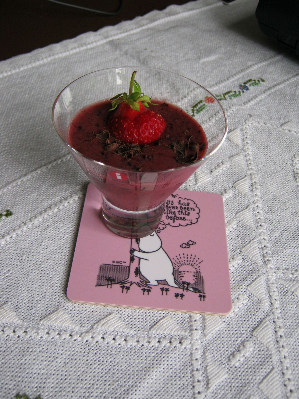 Tässä vaikkapa tervetuliaismaljaksi sopiva mansikkaherkku. Sisältäen mustikkaa, mansikkaa, banaania, tammenlehtisalaattia, muutaman basilikan lehden, vaniljajugurttia ja vettä. Unohtamatta tummaa suklaata lastuina.