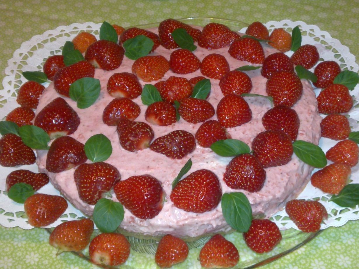 Mieheni ylennyksen kunniaksi tein hänelle mansikkaisen juustokakun. Koristelin kakun tuoreilla mansikoilla ja piparmintun lehdillä.