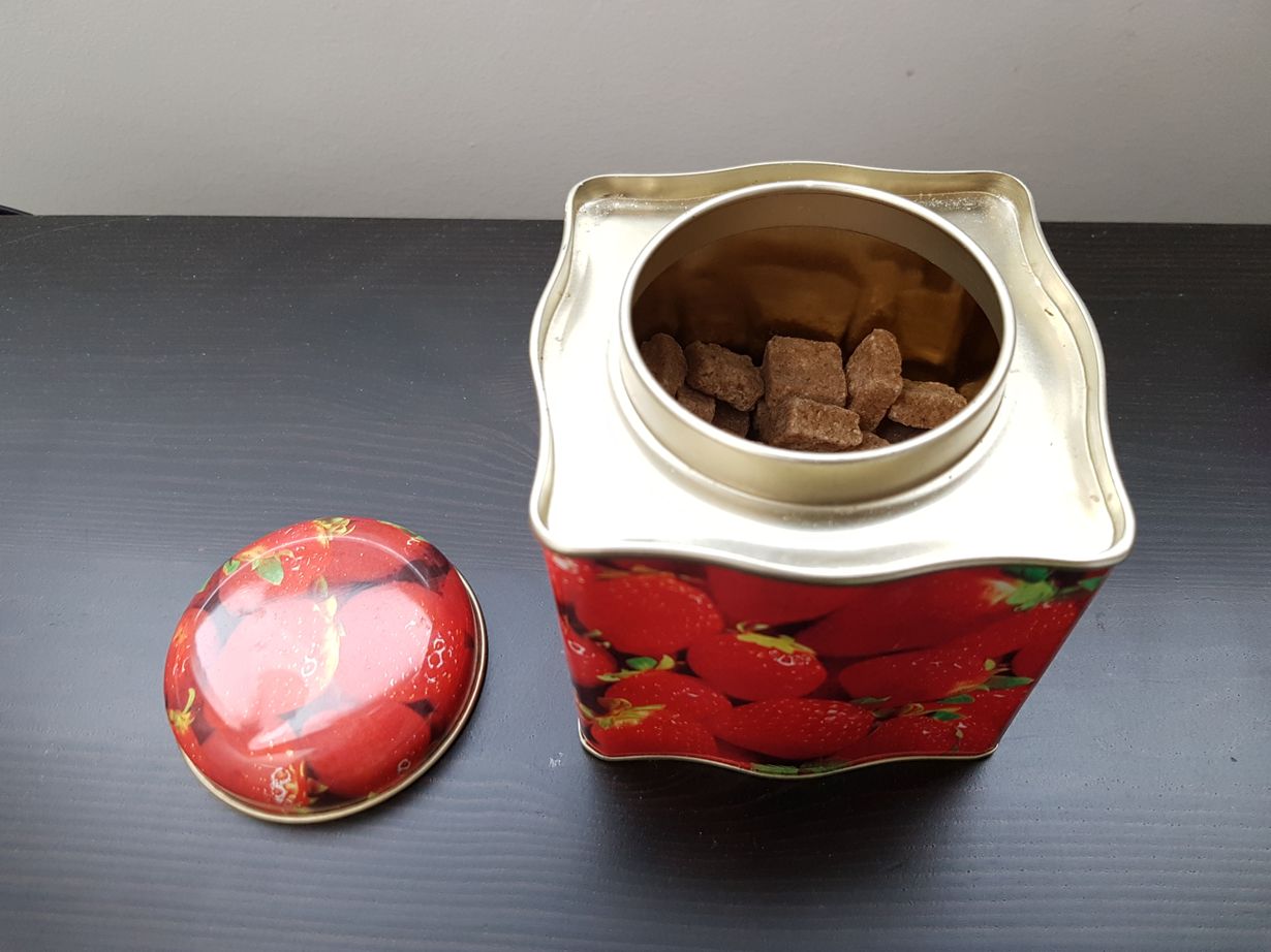 Kuvassa mansikkateemaisen ylioppilaslahjan mukana tullut rasia, josta myöhemmin on tullut sokerikippo.