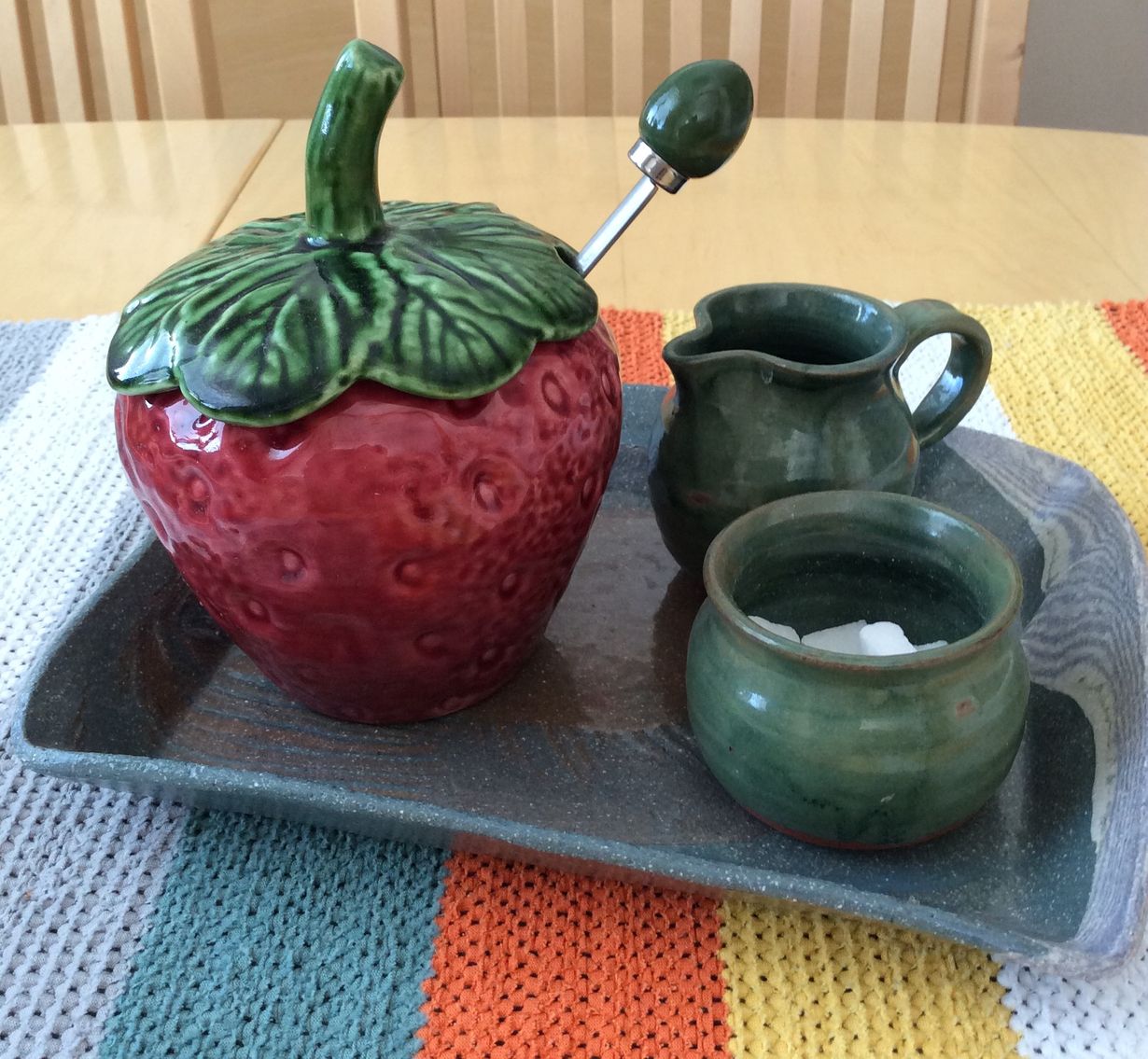 Mansikkakipossa on aina hienoasokeria, vaikkapa aamuviilin päälle. Käsityöpajasta ostetussa pikkuisessa saviruukussa on palasokeria mummoa varten. Sen parina on samanlainen pieni kerma-astia.