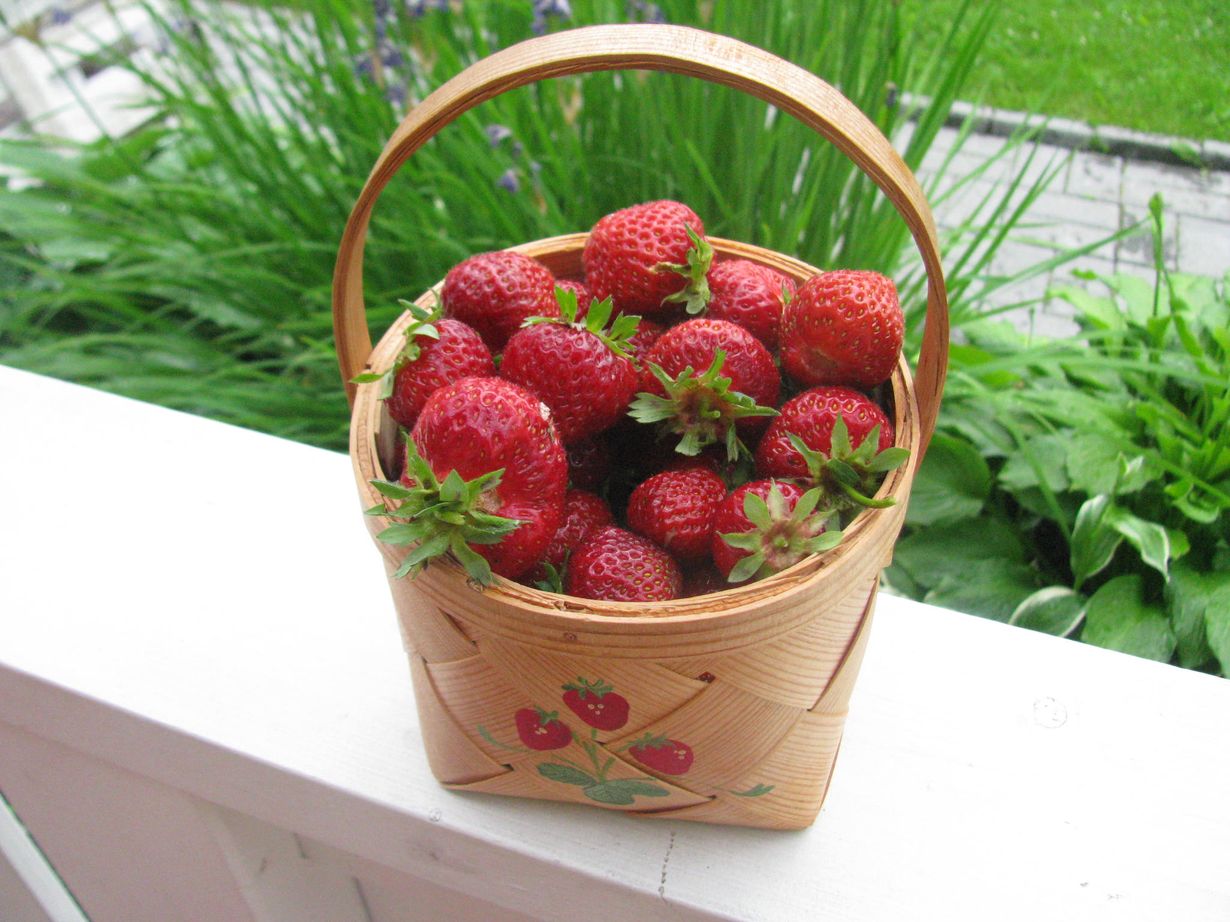 Kori on lasten mansikkakori, johon he keräävät oman mansikkapenkin mansikat aina kesäaamuisin. Sitten yhdessä maistelemme mansikoita aamupalaksi.