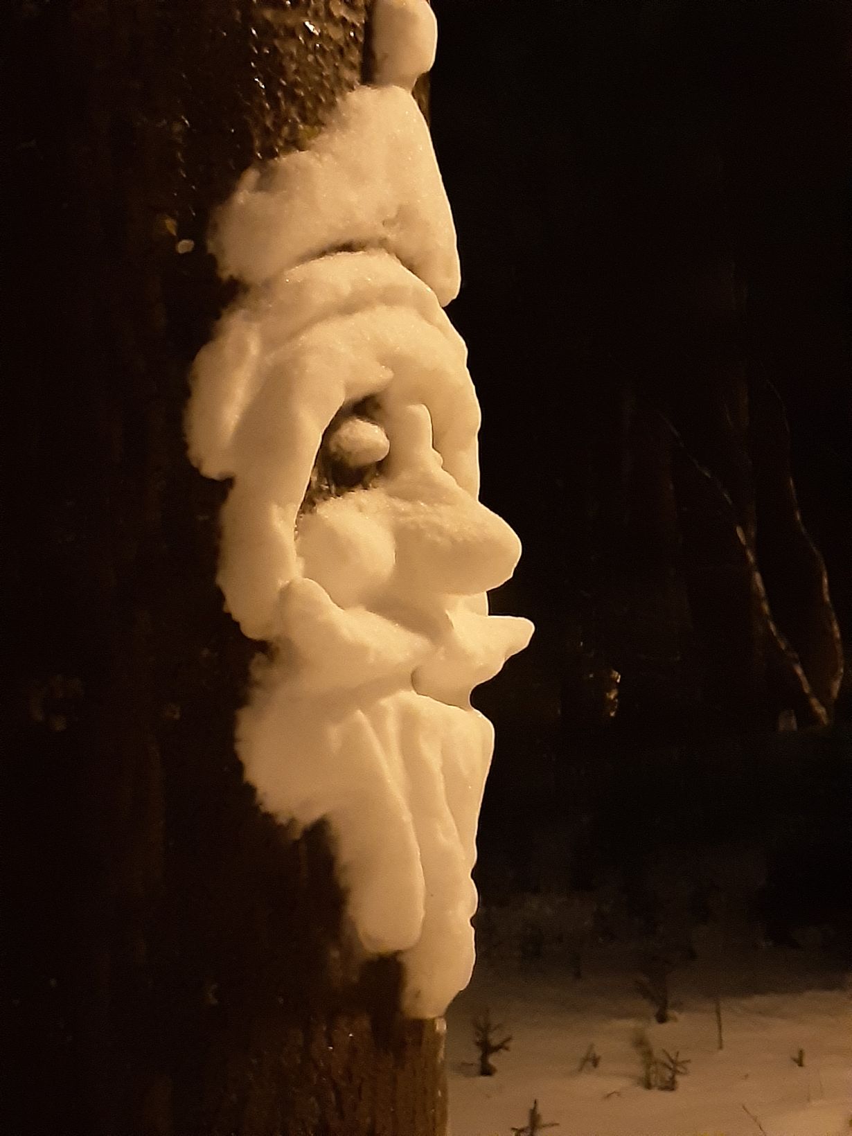 Viime vuonna joulukuussa lähipuiston mänty heräsi eloon ja lenkkipolun molemmin puolin olevia mäntyjä koristi upeat joulupukin naamat. Tuntematon taiteilija oli nähnyt paljon vaivaa taideteosten tekoon ja ne ilahduttivat pitkään lähistön asukkaita ja vieressä olevan päiväkodin lapsia. Kuopio