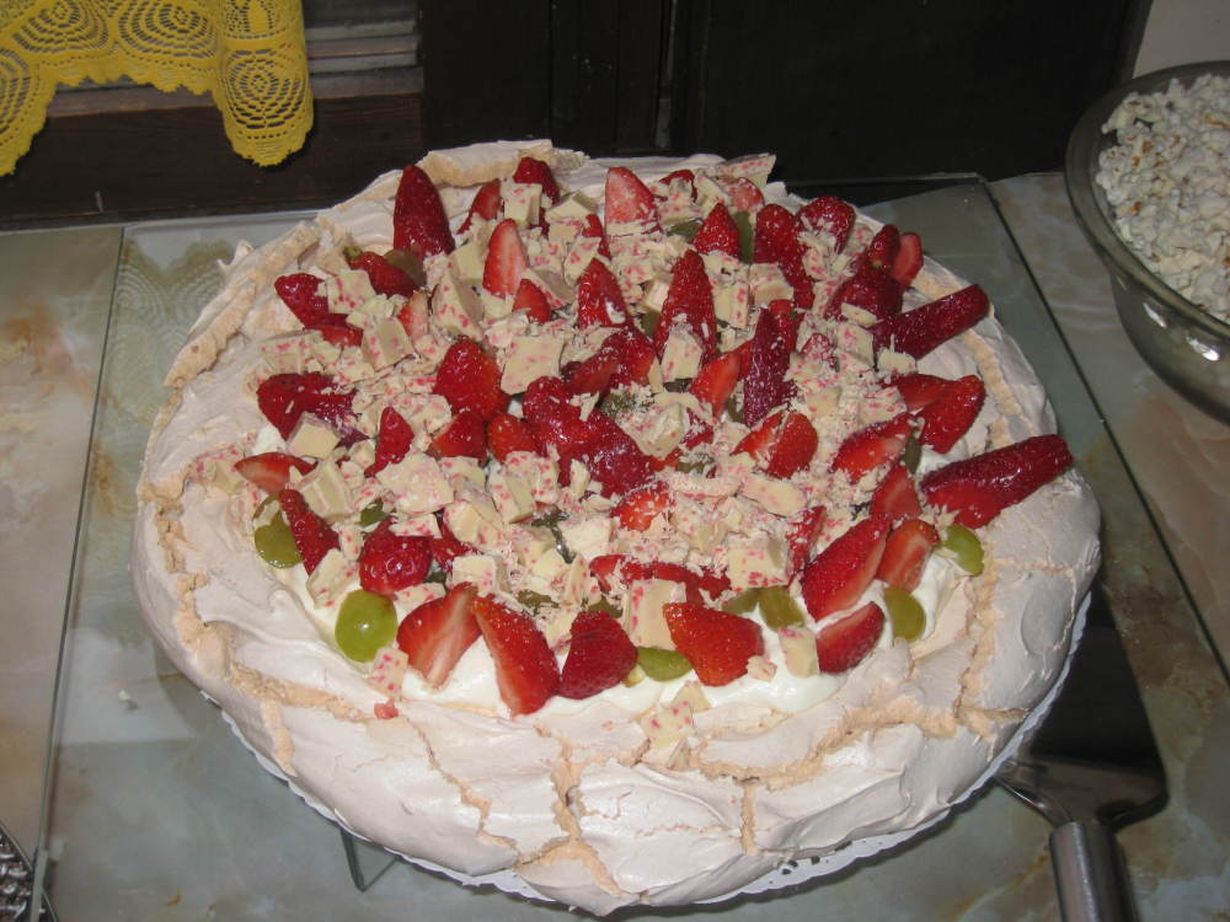 Tämä marenkikakku oli tyttäreni 2-vuotissyntymäpäiväkakku. Täytteenä on kermaa, tuoreita mansikoita, viinirypäleitä ja mansikka-valkosuklaata. Ihanan äkkimakea vaihtoehto tavalliselle kermakakulle.