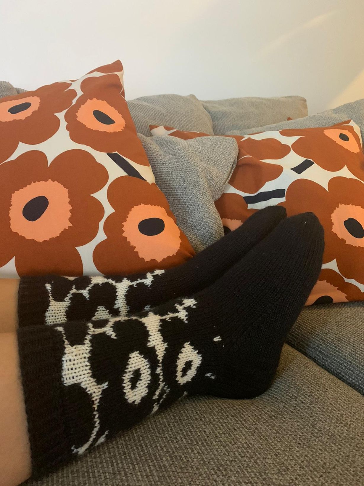 Syksyn väreissä olevat tyynyt, ja joka vuodenaikaan sopivat mustavalkoiset unikkokuosiset villasukat. Voiko unikkoa olla liikaa? Mielestäni ei missään nimessä!