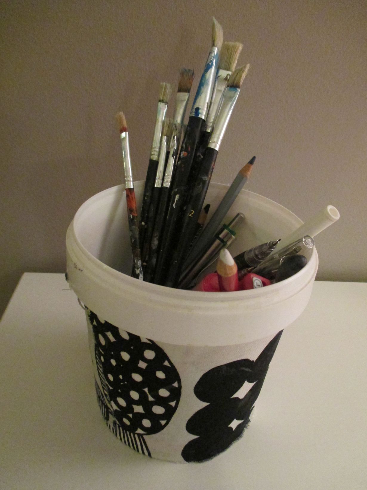 Askartelin tämän kynätelineen turkkilaisesta jogurttipurkista, johon liimasin kaistaleen Marimekon jämäkangasta. Aikaa meni ehkä noin 2 minuuttia, joten suosittelen kokeilemaan!