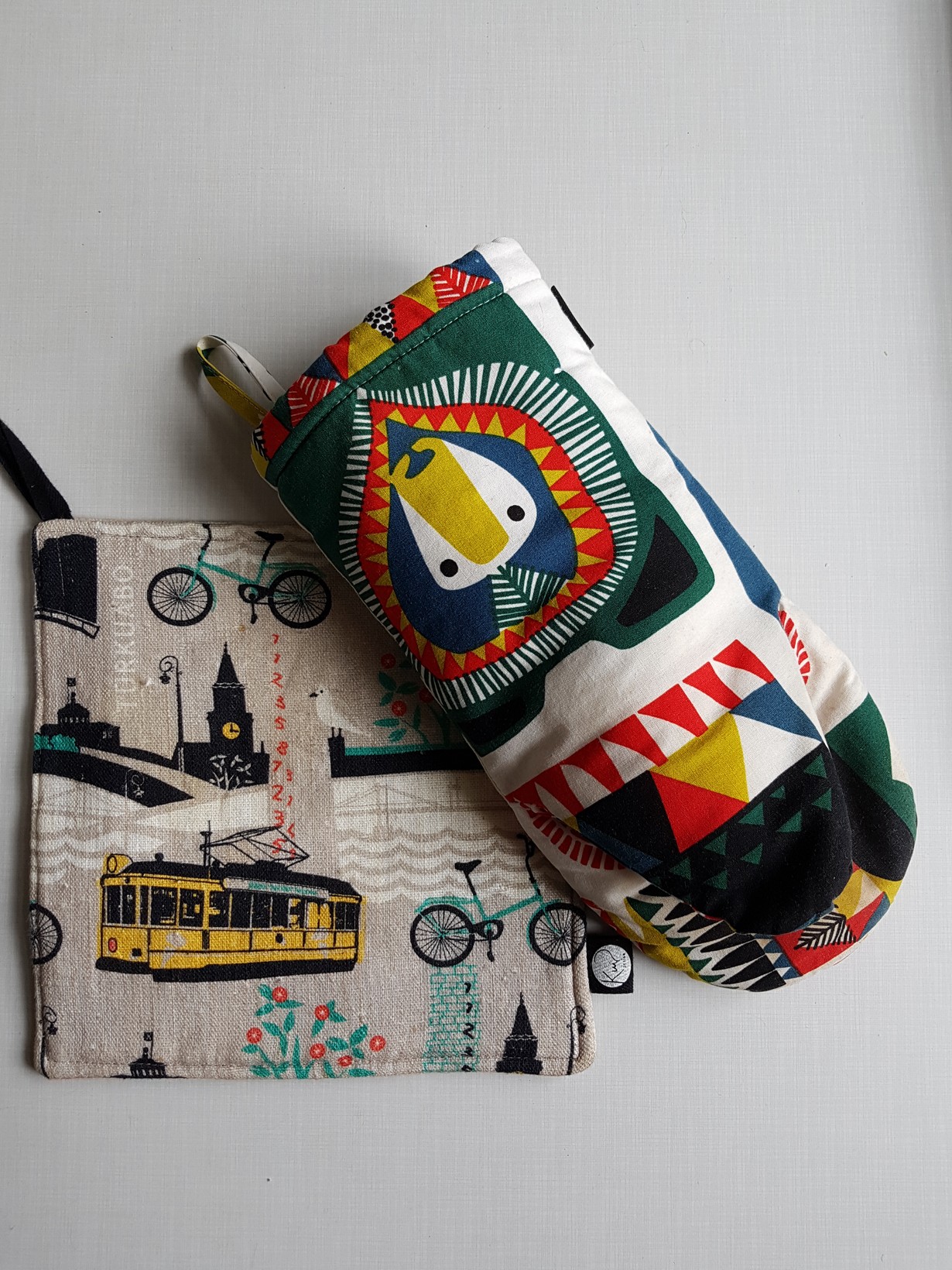 Ihastuimme mieheni kanssa ikihyväksi Marimekon Kukkuluurun rikkaaseen värimaailmaan ja toteemimaisiin eläimiin. Meillä on myös saman kuosin pussilakanasetit sekä peltipurkki kahville. Turku-aiheinen patalappu roikkuu patakintaan kaverina keittiössä.