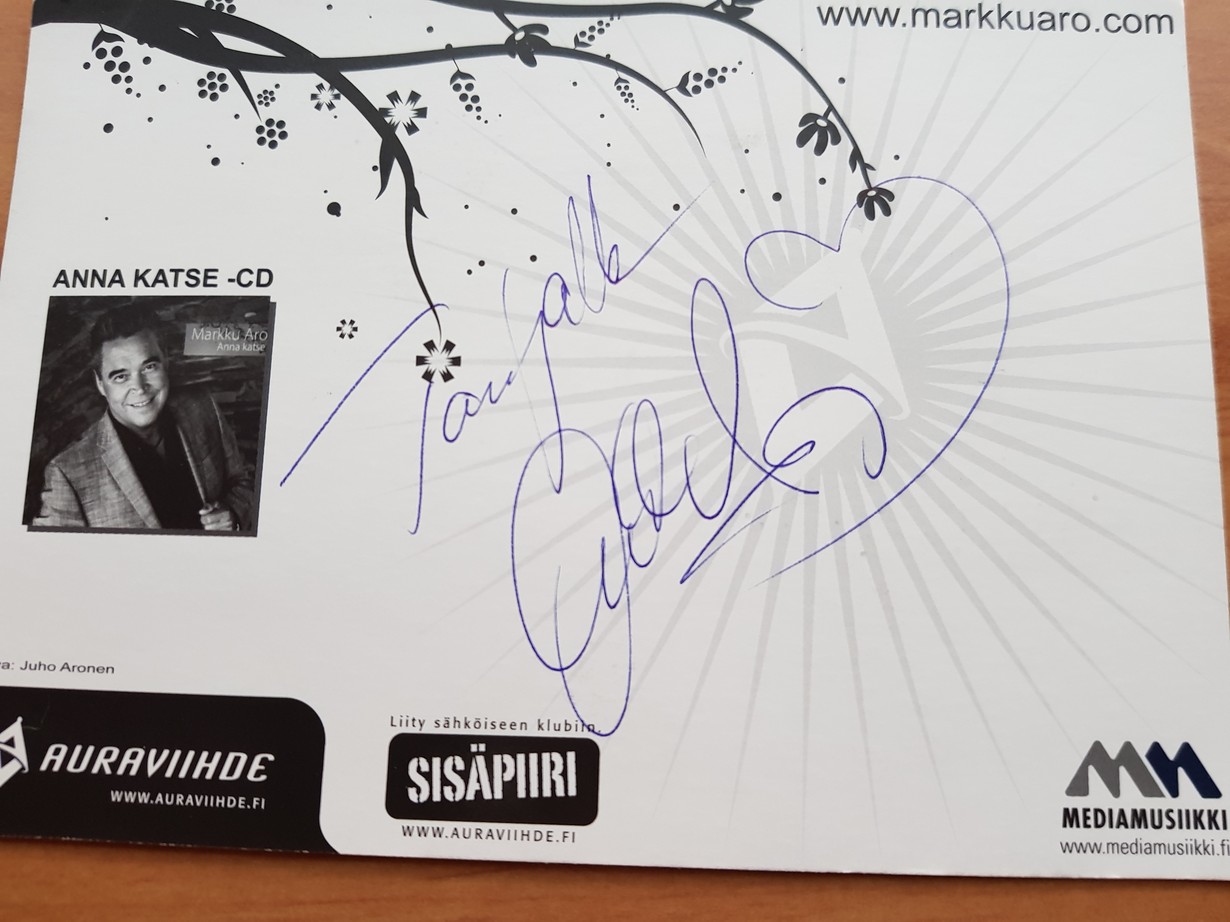 Lähetä kuva julkkiksen nimmarista – voit voittaa Arabian Pastoraali-astioita! Markku Aro nimmari -70 luvulta fani 5.1.2020 klo 11:50 Markku Aron nimmari 16.8.2014 Nurmen lavalla.Hyvää musiikkia.Kuuluin fanikerhoon 1970-luvulla.