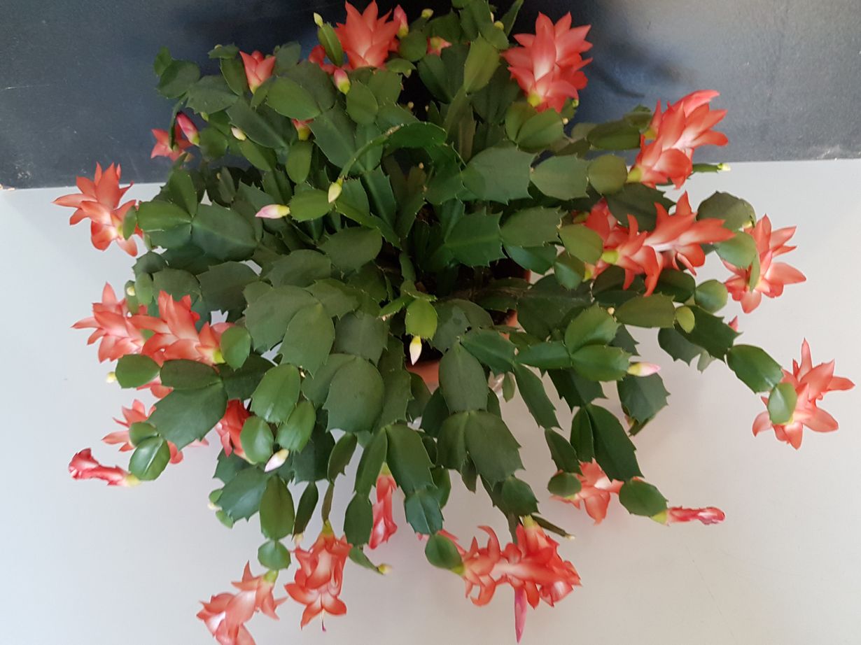 Turun Terveystalon odotusaulan käytävällä oli ikkunan edessä valtavan suuri marraskuunkaktus täynnä lohenpunaisia kukkia. Ihastuin niiden väriin ja seuraavalla kerralla siellä käydessäni pyysin luvan ottaa siitä muutaman pistokkaan. Juurrutin ne ja istutin purkkiin. Kaktus on säännöllisesti kukkinut joka vuosi marras- joulukuussa ja olen uusinut sitä aina, kun se on kasvanut liian suureksi.