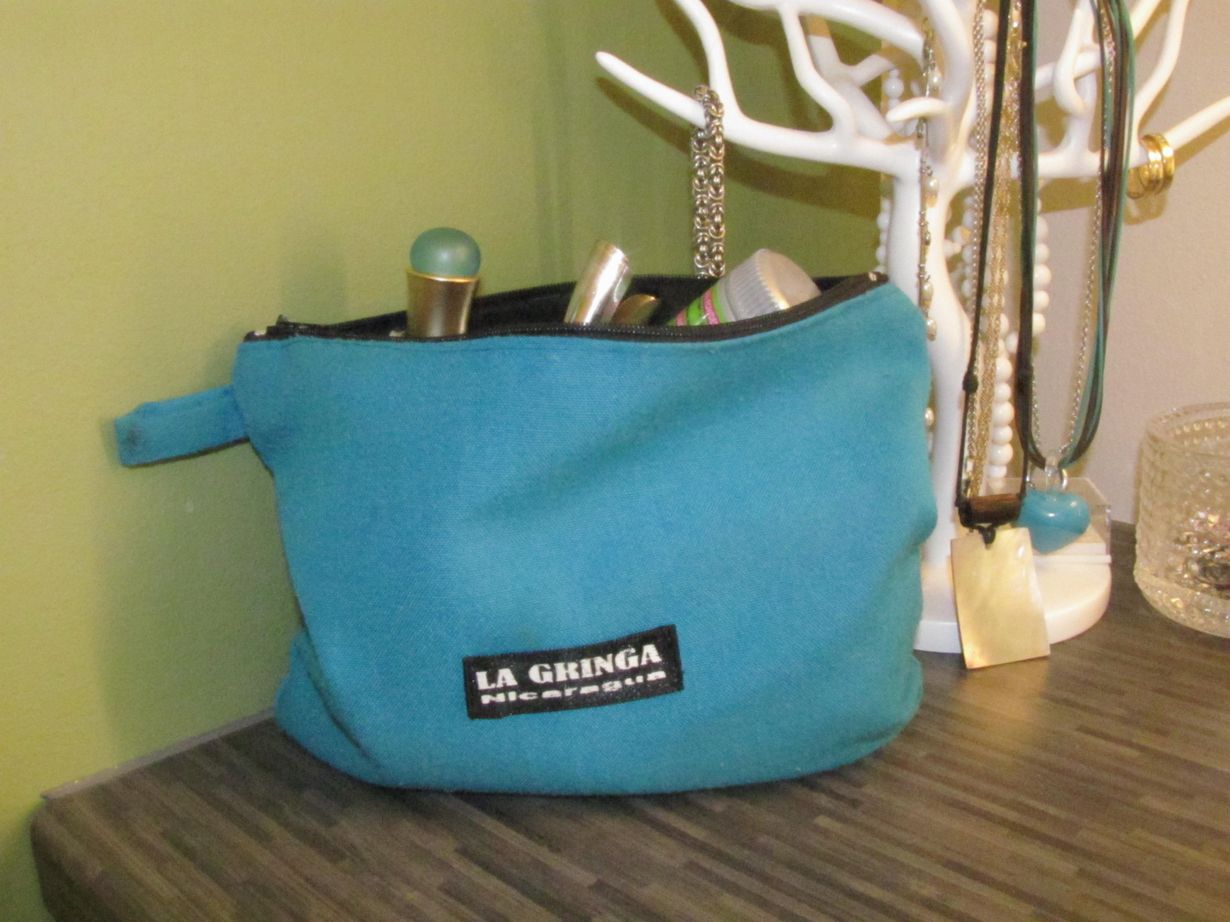 Tämä pirteän värinen pussukka on juurit sopivan kokoinen ETYK(ei tule yöksi kotiin)-paketiksi. Pussukka on ommeltu Nicaraguassa, Granadan kylässä ja merkin toisella puolella lukee ompelijan nimi.