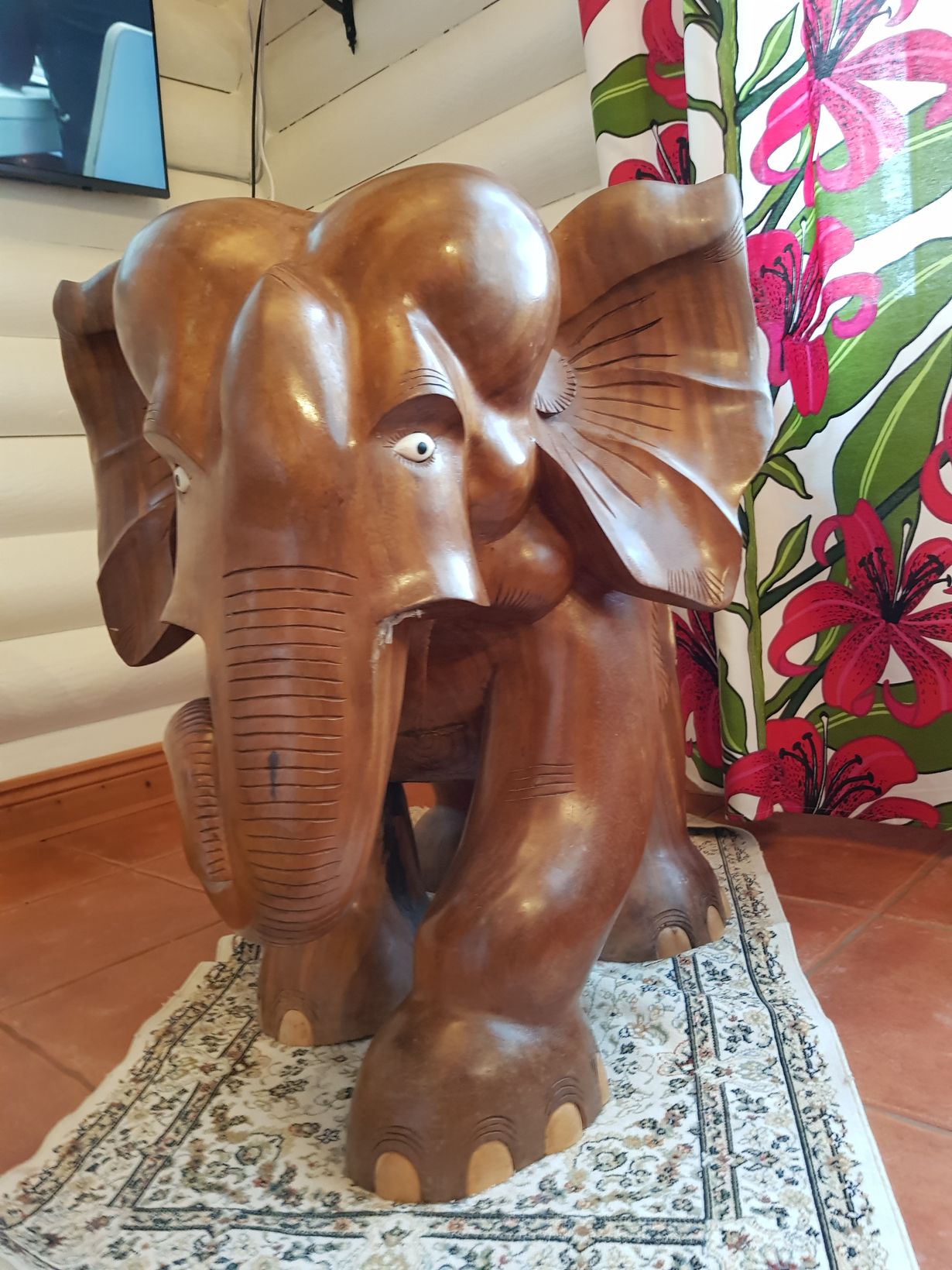Yli kaksikymmentä vuotta sitten lomailimme Sri Lankassa, Hikkaduwa-nimisessä paikassa. Rantakadulla ihailimme norsunveistäjien töitä. Niimpä kävi, että selvitettyämme norsun kujetusasian lentokoneessa päädyimme ostamaan tämän ei niin harvinaisen, mutta erikoisen norsun. Painoa tällä matkamuistolla on 100kg. Kotiin saimme sen muutaman päivän viiveellä, koska jokaiseen kotimaan lentokoneeseen se ei mahtunut. Syöksyhampaat olemme irroittaneet siitä, etteivät pienet lapsenlapset satuta niihin itseään.