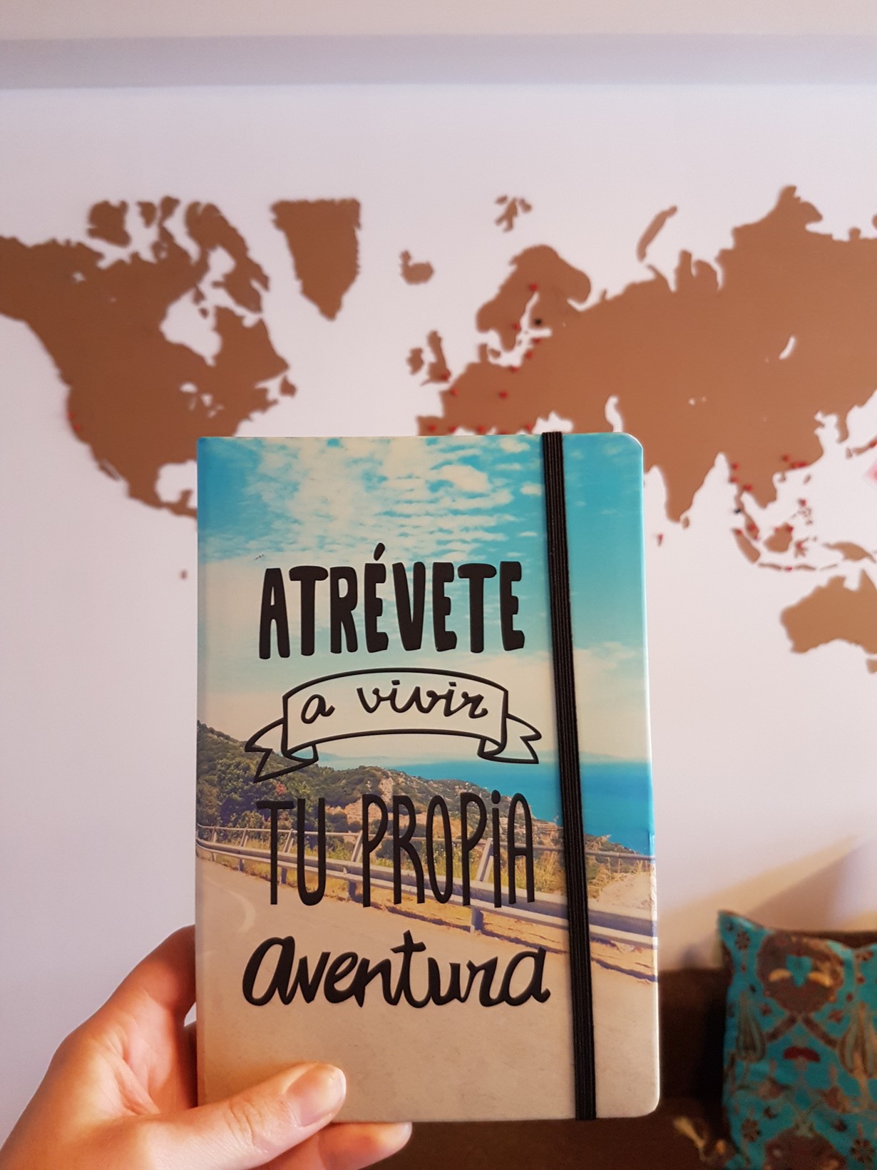 Portugalista ostettu matkapäiväkirja muistuttamassa ihanista seikkailuista maailmalla. Kannen espanjankielinen teksti tarkoittaa "uskalla elää omaa seikkailuasi".