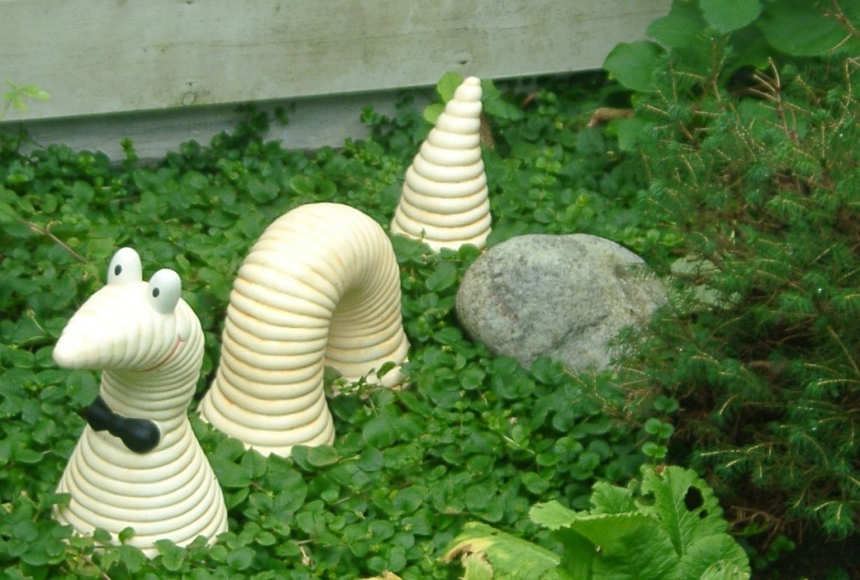 Ostin madon monta vuotta sitten Puutarhamessuilta. Missään muualla en ole nähnyt samanlaisia. Yleensä nostan sen syksyllä ennen lumia turvaan seinän vieressä olevaan laatikkoon. Viime syksynä se kuitenkin unohtui lumen alle ja valitettavasti valkoinen pinta päässä ja silmät vaurioituivat. Jotain fiksausta täytyy yrittää keksiä, koska mato on tärkeä hahmo pihallamme. Kuva on otettu silloin, kun hän oli vielä voimissaan.