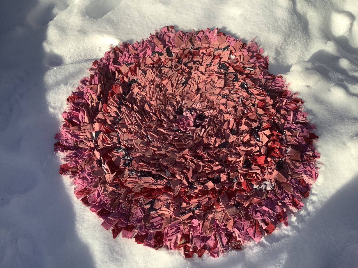 Tämä matto on ystäväni tekemä vanhoista ruusunpunaisista mekoista. Se kerää kaikki roskat piiloonsa hyvin ja kauniisti.