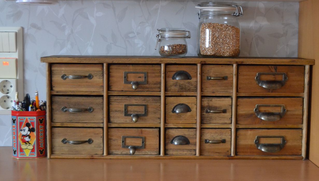 Mausteeni ovat työpöydällä uusvanhassa laatikostossa. Tulevan keittiöremontin jälkeenkin laatikosto pysyy samassa käytössä.