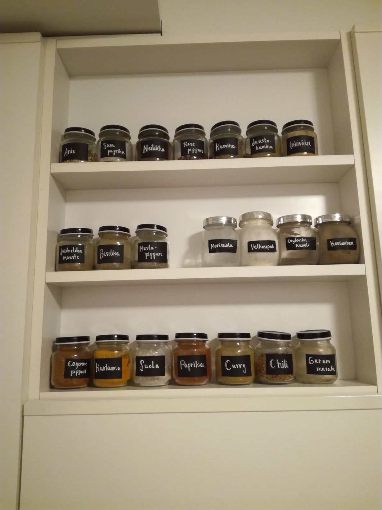 Rakastan mausteita ja koska ne ovat näkyvällä paikalla, haluan hyllyn olevan siisti ja houkutteleva. Tykkään että mausteet olisivat samanlaisissa purkeissa. Rahaa ei kuitenkaan aina ole hienoimpiin purkkeihin ja tykkään tehdä itse. Tässä hyllyssä yhdistyy siis tämä kaikki!