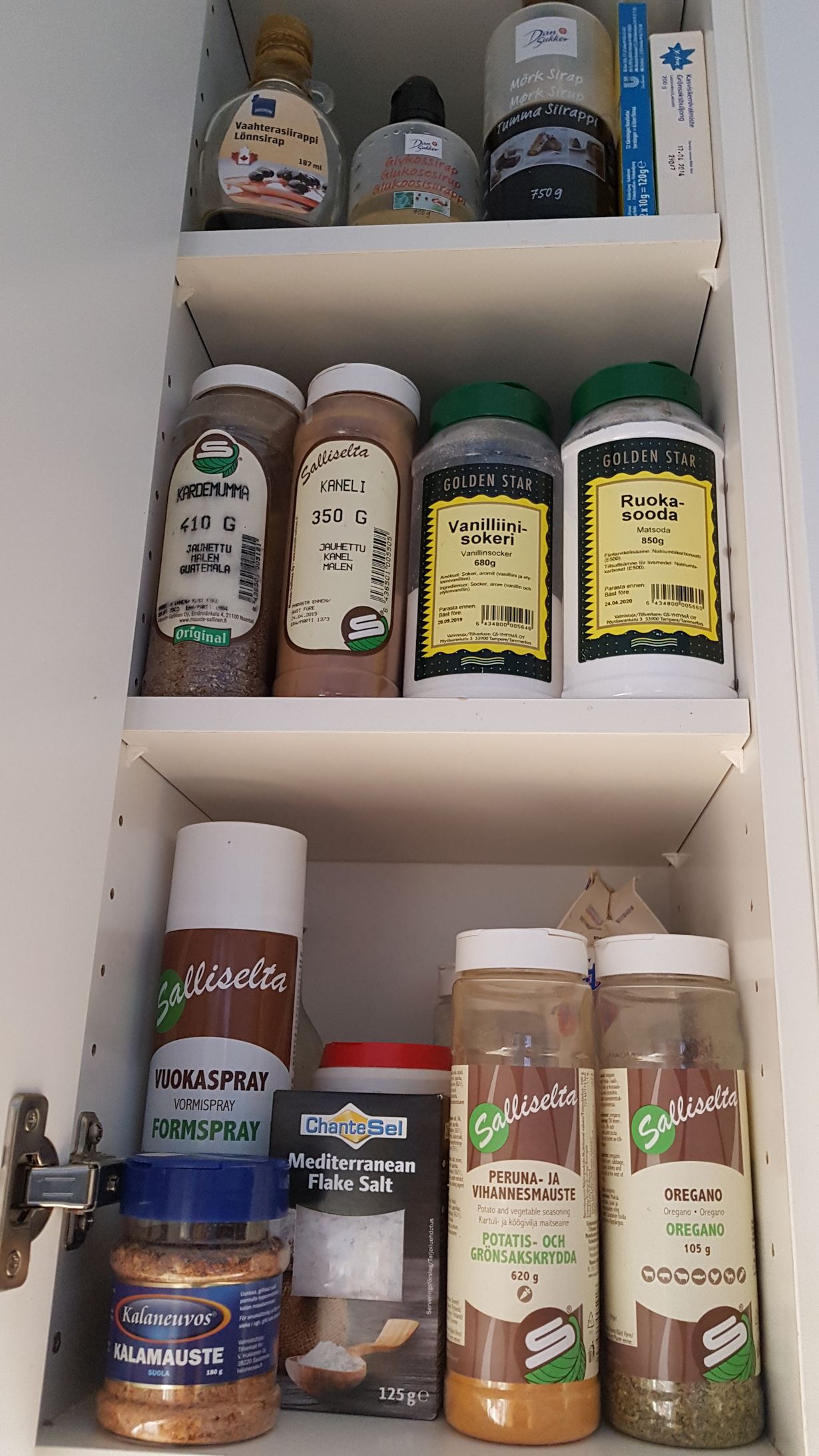 Kuvaa maustehyllysi – voit voittaa Linnea-aterinsetin Maustehylly MinnaK 1.2.2018 klo 15:44 Mausteeni löytyy kaapista, koska ostan yleensä jättipakkauksia. Edessä tärkeimmät ja takana harvemmin käytettävät.