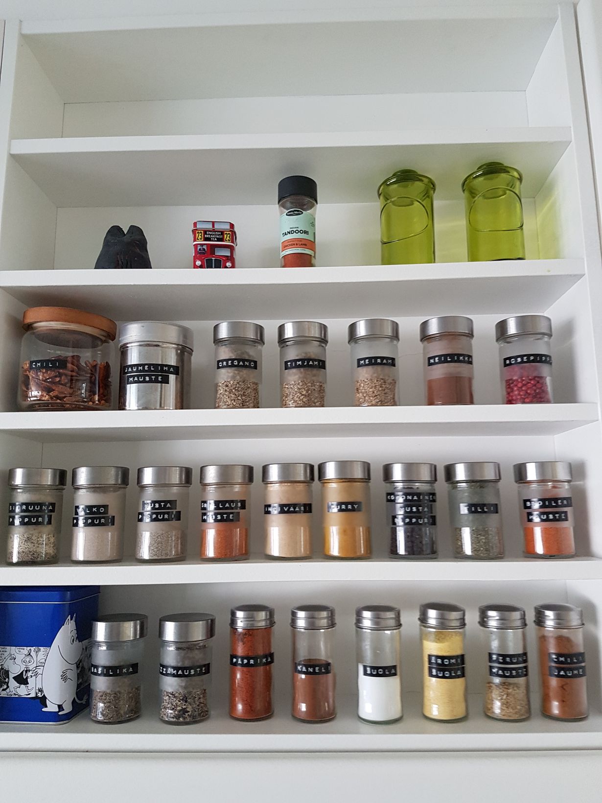 Meidän avoin maustehylly. Tosi kiva muuten, paitsi purkkeja saa olla melko tiuhaan pyyhkimässä.