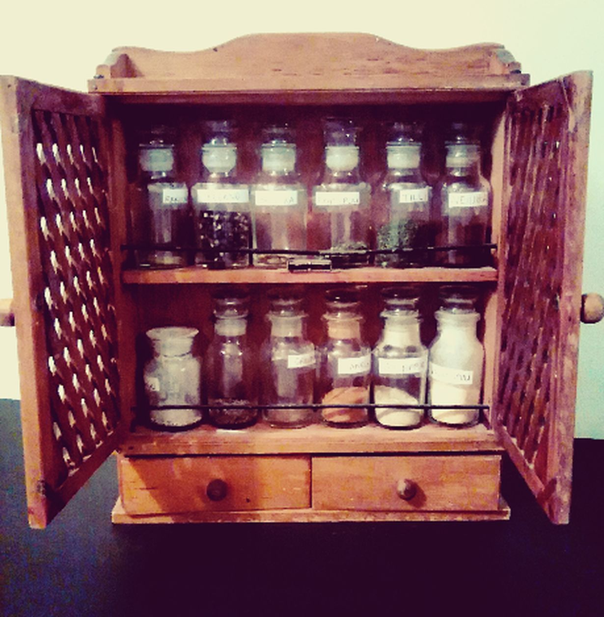Tämä maustehylly on peräisin lapsuudenkodistani. Äitini sai sen veljiltään lahjaksi 1974. Maustekaapin pienissä laatikoissa voi säilyttää aarteita.