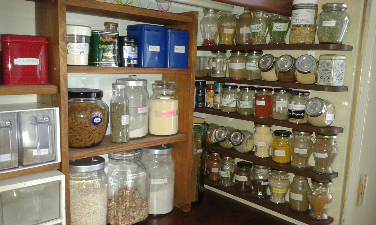 Ostin 10 vuotta sitten 1910 rakennetun mummon mökin ja se on nyt remontoitu. Keittiökalusteet löysin toisaalta ja ne modifioitiin keittiööni sopivaksi. Maustehyllyt nikkaroin työtason reunaan ja korkeankaapin sivuseinään. Kaikki tarvittaessa hyvin esillä.