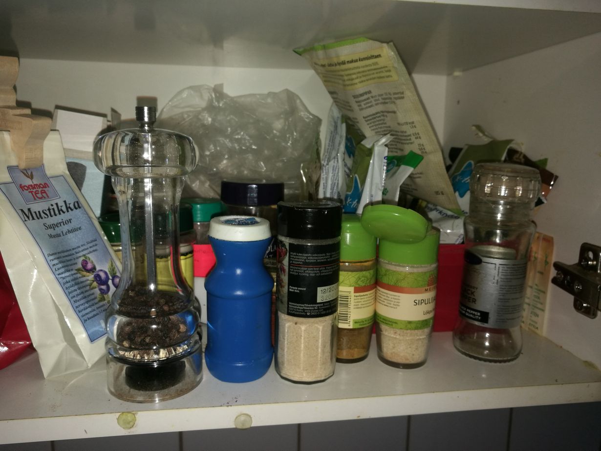Maustehyllyä ei voi käyttää, koska liesituuletin toimii vaan tiettynä aikoina eikä sitä voi itse säätää. Joten hylly on aina ihan rasvainen.... Pakko pitää mausteet kaapin alahyllyllä, järjestykses vähän parannettavaa..